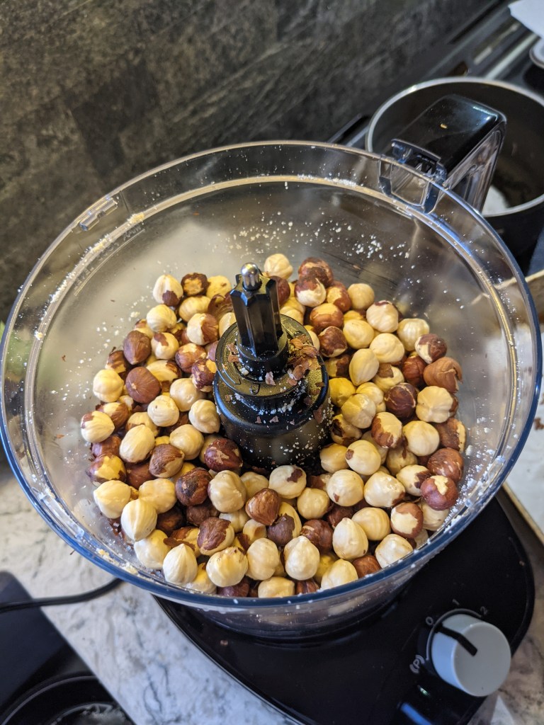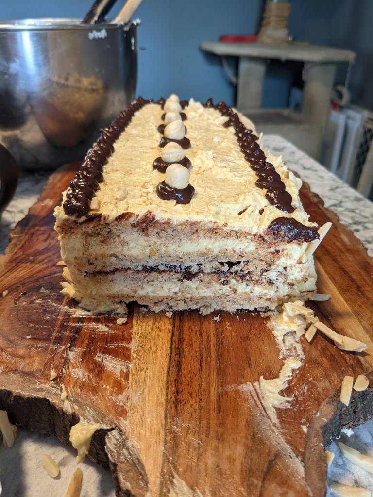 After blitzing the pralines into powder, they get folded into the French buttercream. Now it’s time for final assembly. The Dacquoise gets cut into 4 slabs and stacked with alternating layers of ganache and french buttercream. Then the whole cake is masked with buttercream. Toasted almonds are pressed into the sides of the cake and then toasted hazelnuts are placed on top as accents. Kisses of ganache piped around the edges. Voila!
