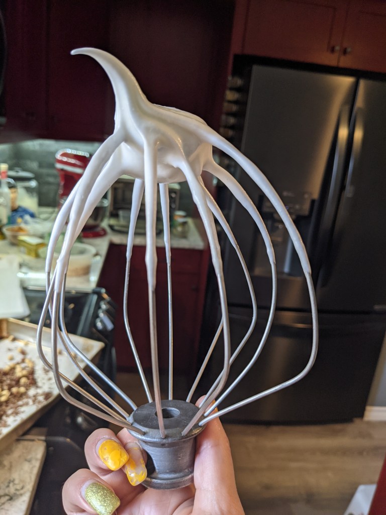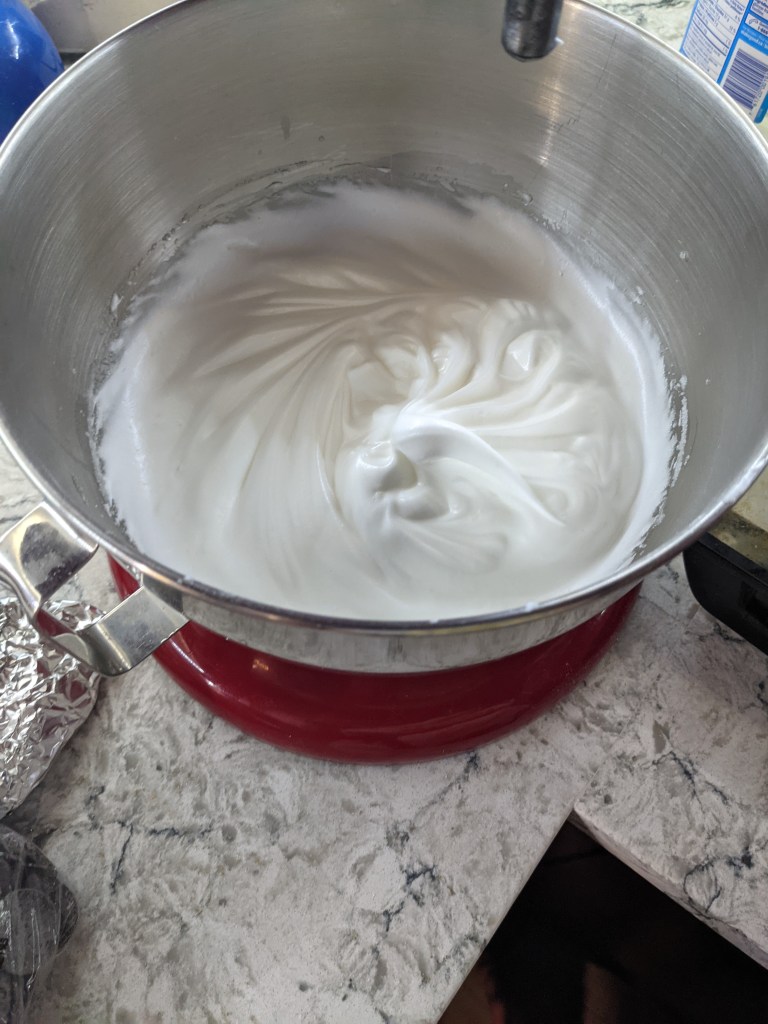 Oh hello, I get to do sugar work again after wrestling with the pralines for an hour? Huzzah! This time wasn’t so bad as I only needed to bring the sugar up to 238F, which is a sugar temperature I am more experienced working with (ASIDE: what even is my life). Also I was motivated because out of all the components of this bake, the French Buttercream was the one I was most interested in learning about. French Buttercream is similar to regular buttercream, but it also includes egg yolks which makes it extra custardy and rich. The heated sugar is streamed into the egg yolks during mixing to gently cook them which creates a fluffy, stable icing. Then butter is slowly whipped in so the icing doesn’t separate or curdle. If done correctly, this is a truly opulent cake filling.