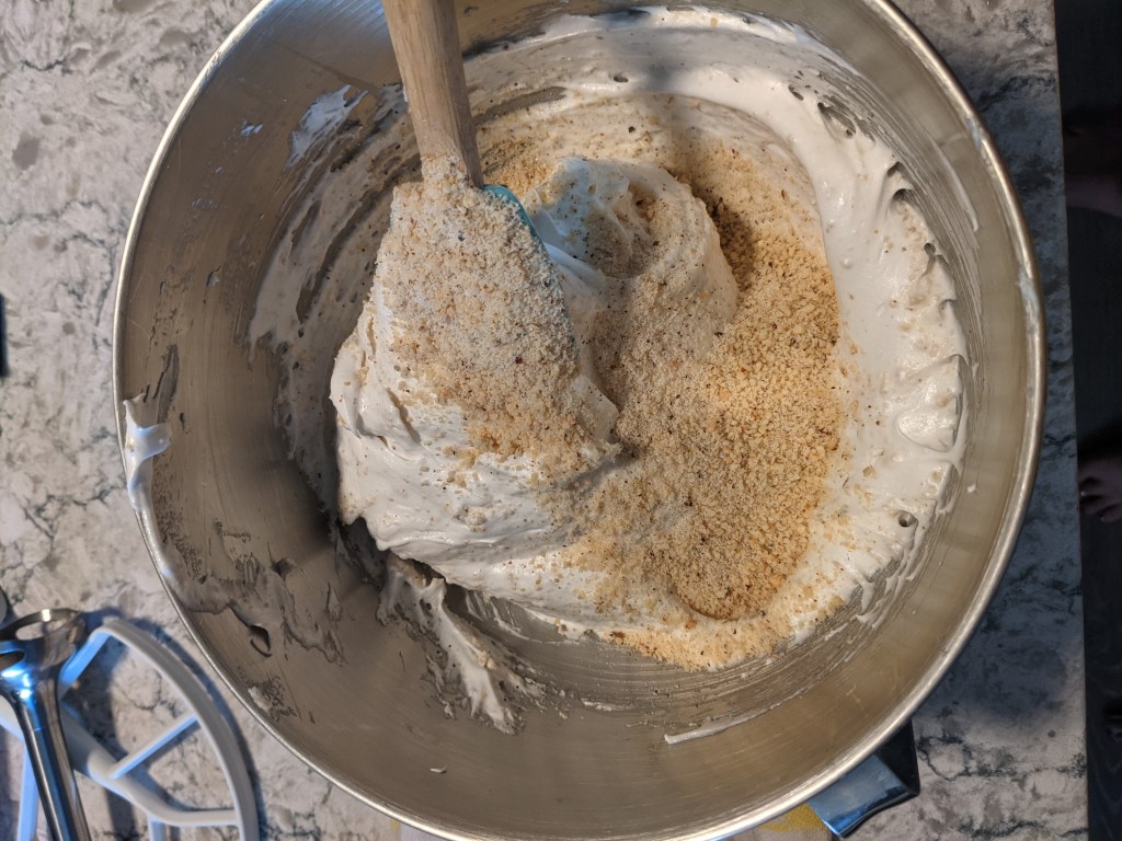 Meringue is such a cruel mistress. I have made meringue what feels like eleventy million many times, and I have been happy with my execution of it exactly once prior to this bake. For some reason, I went into the making of this meringue with unusual serenity, and I know in my bones I got it right. The only thing I would improve the next time I make Dacquoise specifically is I would take about 10 min off the baking time and check it more frequently while cooling in the oven to get a softer centre.The judges on GCBS said it should be crisp on the outside and soft on the inside. The point is, I did the right thing with the egg whites for a change and I know the batter was right going into the oven. So that was a win. I think re-watching the episode the night before helped. Or maybe this project is bolstering my confidence. Or maybe it’s hubris and my next meringue will be a waking nightmare…