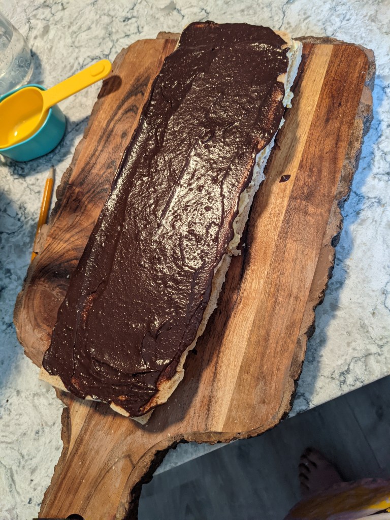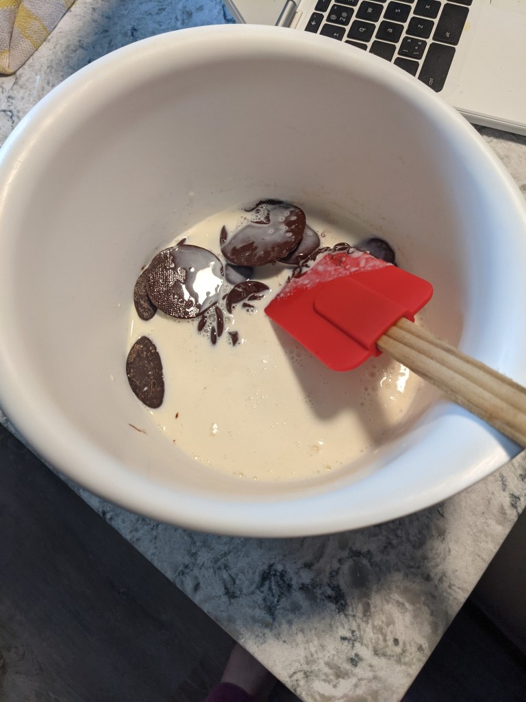 This is the easiest and best preparation of ganache, in my opinion: boil cream, pour over chocolate, add corn syrup, and stir. Delightful. My execution this time around needed to be slightly thicker, so I should have used a bit more chocolate. Unfortunately, the CBC recipe for this bake is given in volume instead of mass (wtf CBC) which is something I am really upset about coming to terms with. Lesson learned.