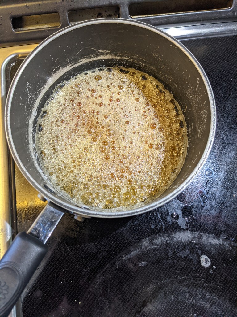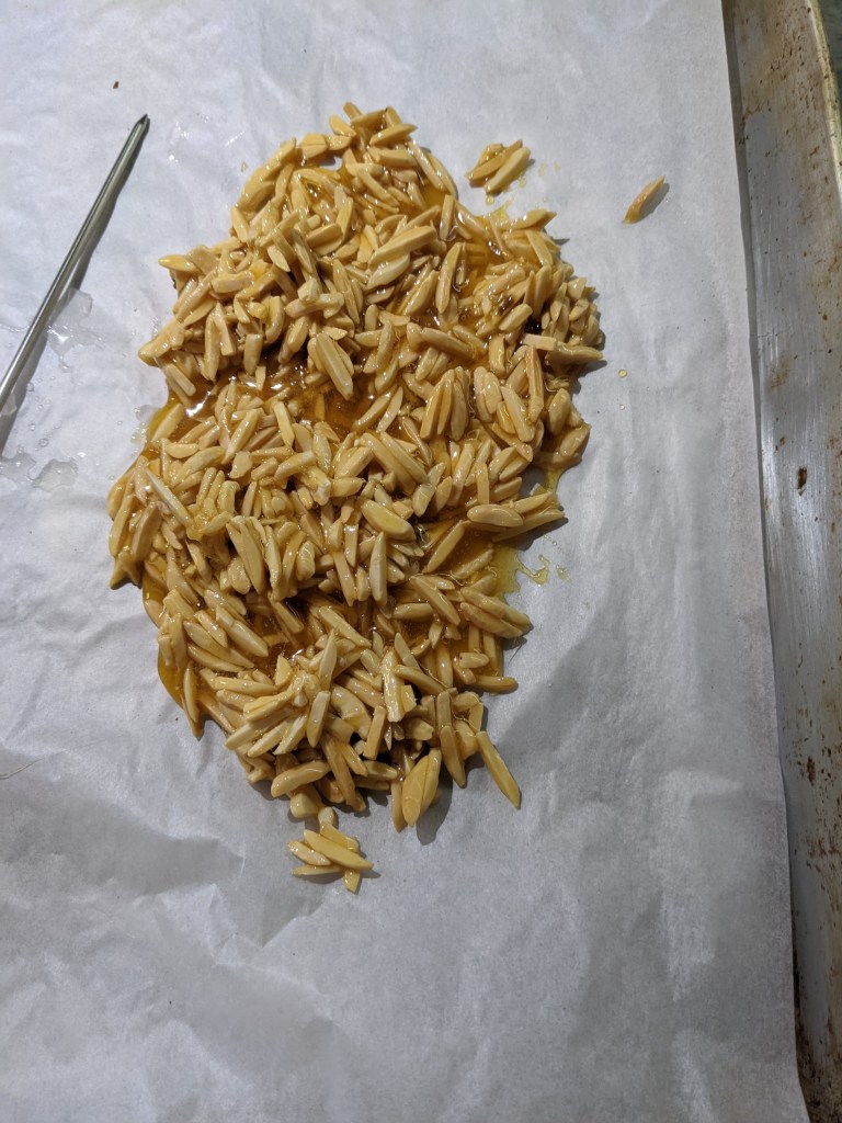 Anyway, this step was mostly just a matter of getting the sugar up to temp to make a medium-amber caramel and then dumping it on the nuts. Once I decided to look at it that way instead of dicking around with the candy thermometer, it worked. This seems to be my plight with candy: I always do better with the old school methods rather than using technology and it B O T H E R S M E. I was sorely tempted to change the recipe and add some corn syrup which would have prevented the crystallization I was struggling with, but I felt that would have been contrary to the spirit of what I am trying to do here. I need to execute these bakes as written! EVEN WHEN THEY ARE WRITTEN IN VOLUME INSTEAD OF MASS (wtf CBC).