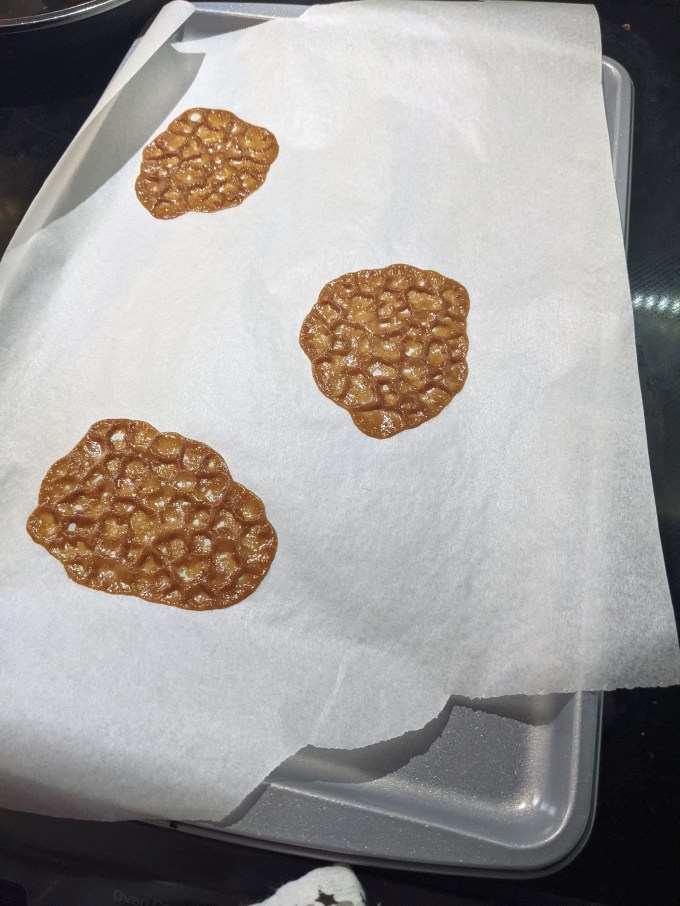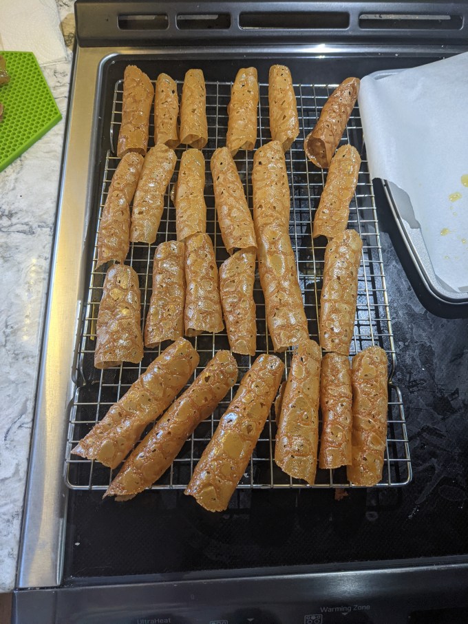 Cookies too small, can’t roll all the way around to make a cylinder: this problem may or may not be more complex than a simple fix. If your batter is starting to firm up (especially towards the end of the bake when you are working with the last half of the batter), make sure you are spreading it thin enough on the parchment paper before it goes into the oven (see note above on cookies being too hard). I found the best way to make these uniform was to spread the batter with my fingers. The batter is so oily, it is very easy to manipulate this way, like gently flattening out wet clay (or so I imagine). Also ensure you are using the same amount of batter for each cookie. The recipe calls for 1 teaspoon each and I was measuring mine pretty exactly. Finally, if the cookies just aren’t spreading out into thin lace in the oven, you might have botched the batter entirely (oops!). It is important that all of the sugar is fully dissolved in the butter before you add the flour. Any undissolved sugar in the batter will get insulated by the flour and the batter will not come up to temperature properly.