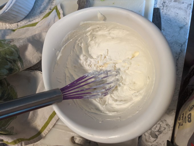The challenge here is knowing when exactly to pull these from the oven and how to roll them effectively without cracking them or burning yourself. The recipe calls for 7 – 9 minutes bake time. I found that 7 minutes and 10 seconds (not even kidding) was perfect for my oven. Once I figured that out, the rolling was simply a matter of practice and patience. I found the best way to do it was to remove the cookies from the oven and let them sit for about 5 seconds just so they weren’t quite so soft and hot. Then I quickly pinched the edge of the cookie and flipped it over the handle of my spatula to curl it. I used gravity to wrap the cookie around the handle, this minimizes the amount of time needed to spend touching it to avoid getting burned and helps to maximize the interior space of the rolled cookie. If you try to squeeze the cookie around the handle, you will probably get burned and squish the cookie and it won’t have a nice, open, cylindrical space in the middle to fill. Once I found the right bake time and method to roll them consistently in one try (these cool so quickly, you only get one try), it was just a matter of rhythm and flow, and that is a good headspace for me.
