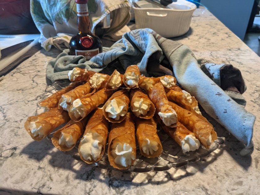 The challenge here is knowing when exactly to pull these from the oven and how to roll them effectively without cracking them or burning yourself. The recipe calls for 7 – 9 minutes bake time. I found that 7 minutes and 10 seconds (not even kidding) was perfect for my oven. Once I figured that out, the rolling was simply a matter of practice and patience. I found the best way to do it was to remove the cookies from the oven and let them sit for about 5 seconds just so they weren’t quite so soft and hot. Then I quickly pinched the edge of the cookie and flipped it over the handle of my spatula to curl it. I used gravity to wrap the cookie around the handle, this minimizes the amount of time needed to spend touching it to avoid getting burned and helps to maximize the interior space of the rolled cookie. If you try to squeeze the cookie around the handle, you will probably get burned and squish the cookie and it won’t have a nice, open, cylindrical space in the middle to fill. Once I found the right bake time and method to roll them consistently in one try (these cool so quickly, you only get one try), it was just a matter of rhythm and flow, and that is a good headspace for me.