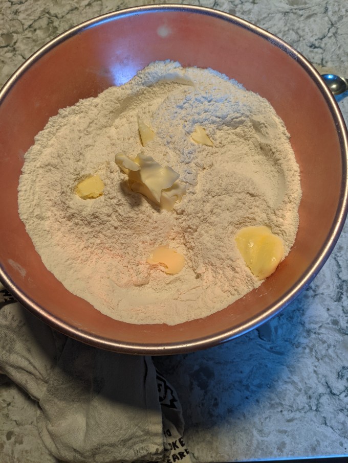 The recipe and the show both made a big deal of not overworking this dough in order to retain some flakiness inside (side note: Austrian friend and my own research suggest this is Not A ThingTM). The dry ingredients are worked with a little bit of butter to coarse crumbs. Next milk, molasses, and water are added to hydrate it. The amount of liquid called for wasn’t enough to pick up all of the flour, so I ended up adding a little more water but I kept it to a minimum to try and stick to the bizarre recipe. This is where things started to get weird.
