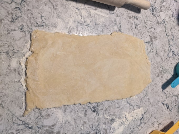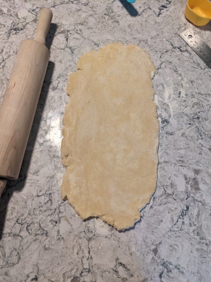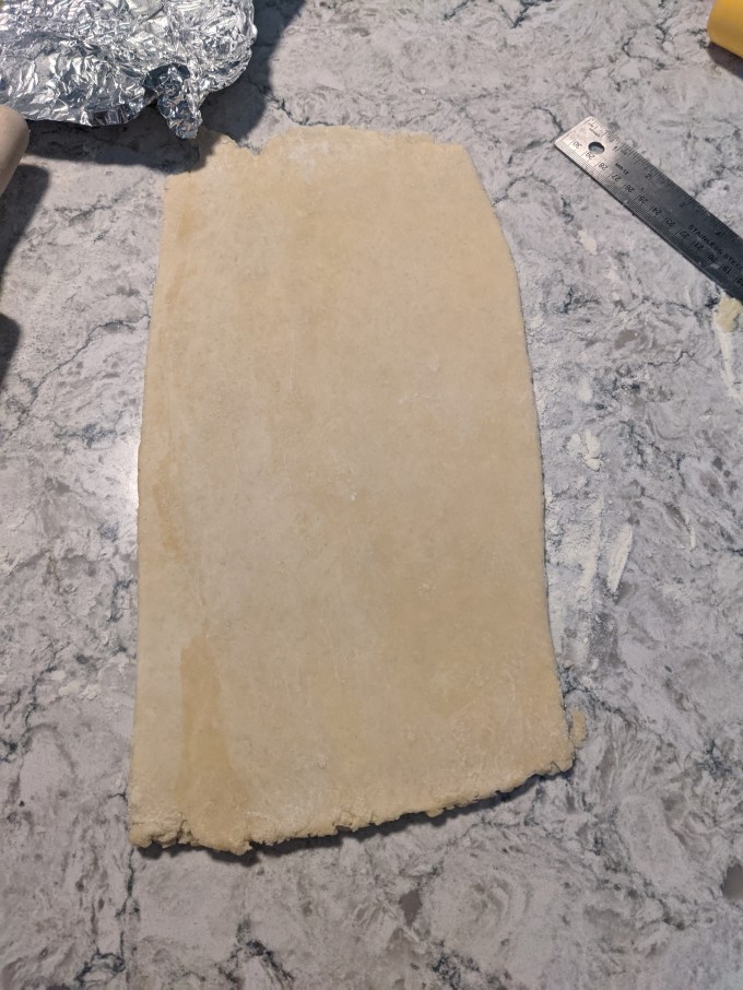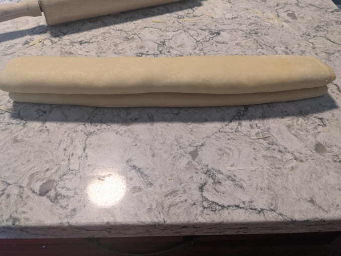 Once the rough puff has had its final rest, it gets rolled out for assembly. Half of the dough gets rolled out over a layer of white sugar then has a generous layer of sugar sprinkled on top. I was seriously resisting the urge to put cinnamon on as well. I left it as written in the recipe, but I will DEFINITELY add cinnamon next time, that will be FANTASTIC.