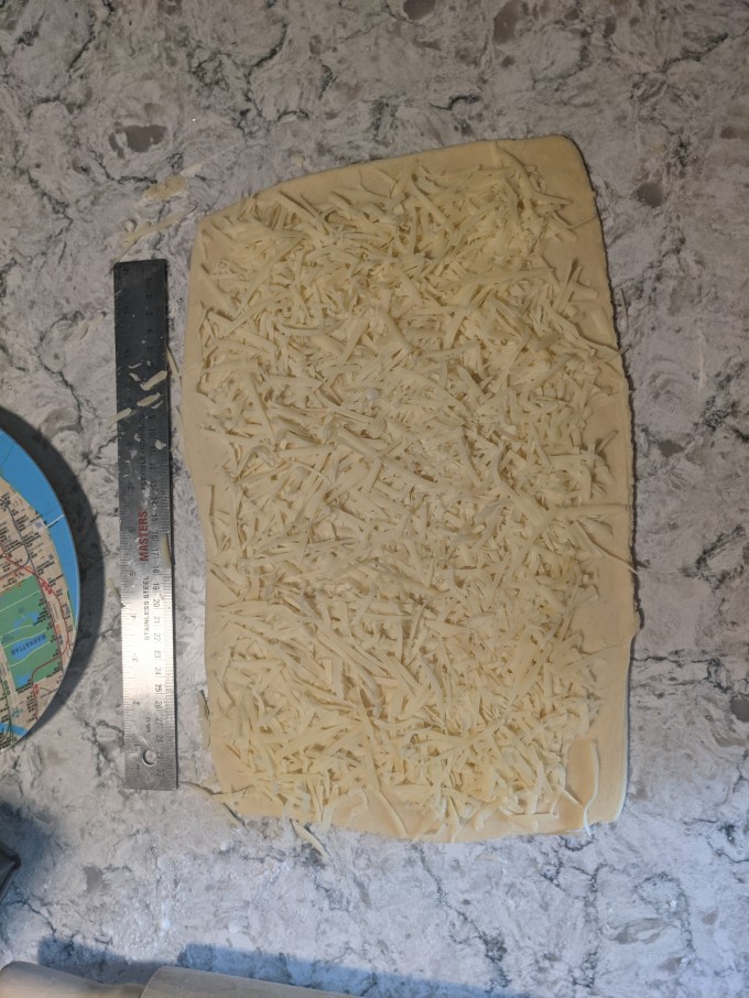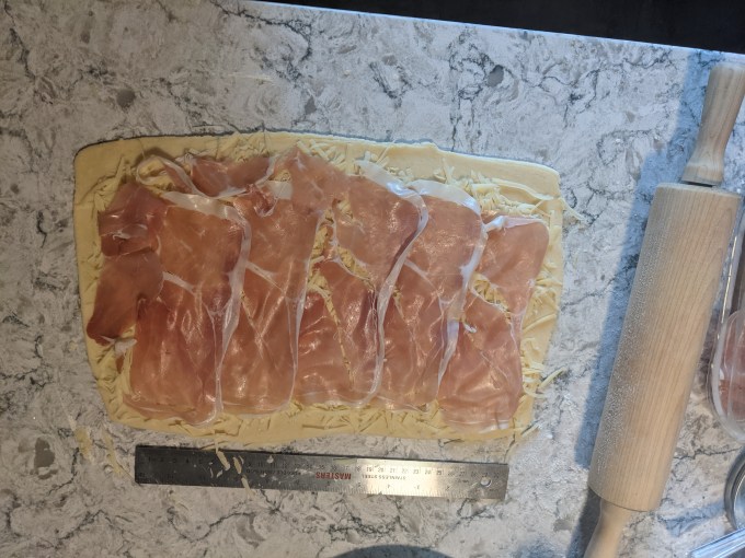The dough for the savoury version gets sprinkled with cheese (I used Gruyere as called for, but the possibilities here are endless) then a single layer of prosciutto is placed on top.