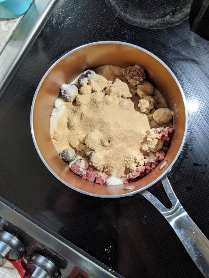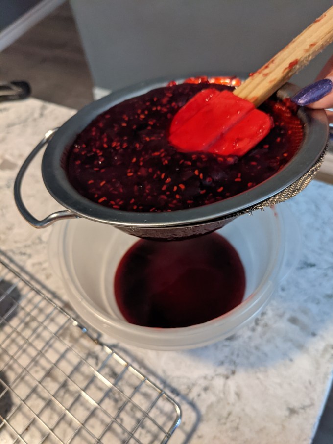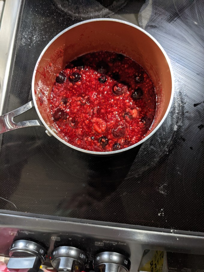 The recipe here was for raspberry jam. On the show, they had no instructions, just “make jam.” The contestants had to guess whether or not to strain out the raspberry seeds, which was expected. I was low on raspberries and for some reason couldn’t find another bag of frozen, so I did a combination of frozen raspberries and frozen mixed berries, which worked just fine. Once again the recipe called for the elusive jam sugar, which I have gotten good at replicating myself using apple pectin.