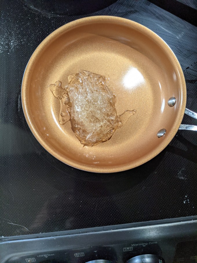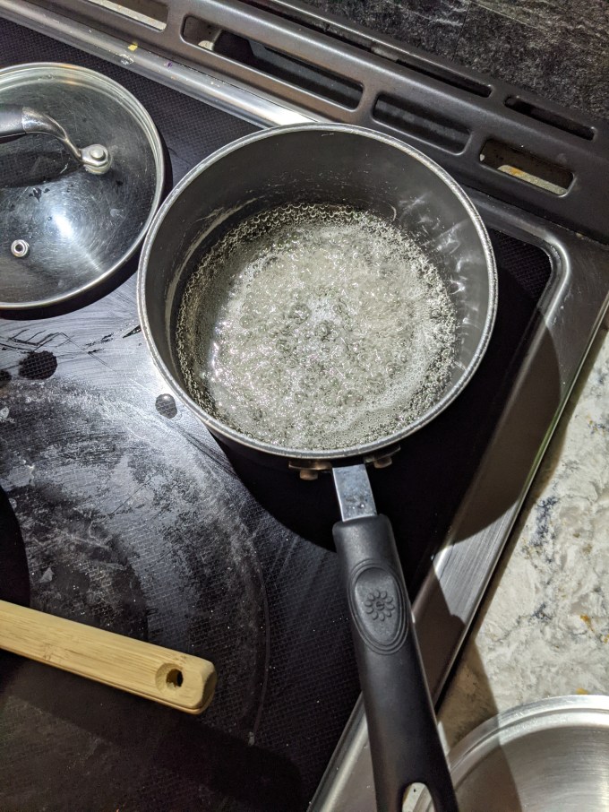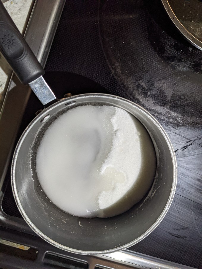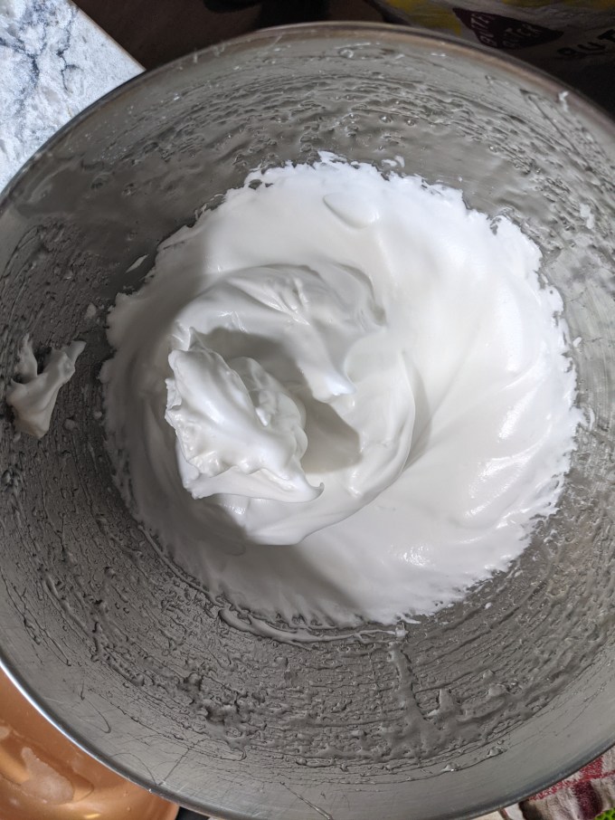 This small victory soon imploded as I descended into agony with the rest of this bake. While the sugar is heating, sheet gelatin is bloomed in water, squeezed out, and warmed on low heat until melted. Egg whites are brought to soft peaks and then the hot sugar and melted gelatin are streamed into the beating whites together to come to stiff peaks.