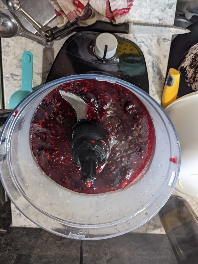 The fruit and sugar are boiled down together. I threw mine into the food processor to puree everything and put it back on the heat to cook. The pectin needs to cook at temp for a while, and some of the water needs to evaporate to get a proper gel consistency. Once the mixture had thickened sufficiently, I strained it out and left it to cool.