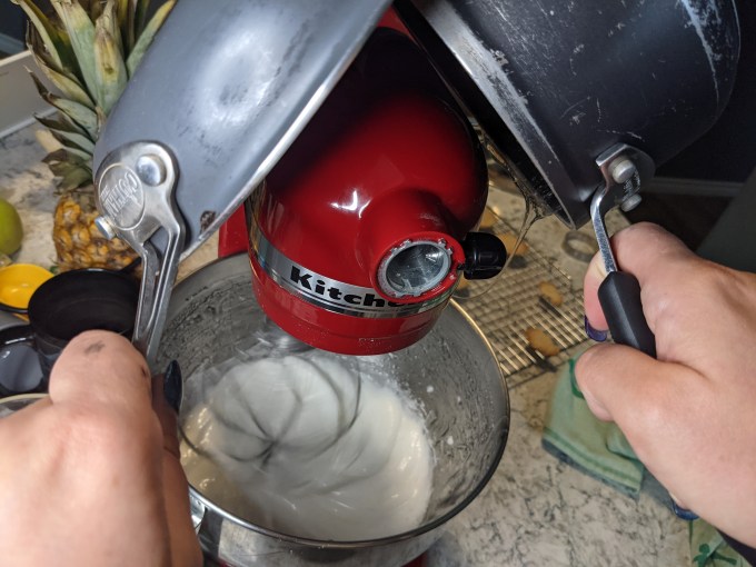 I should have had the egg whites started sooner so the syrup was still warm/hot by the time I needed to stream it into the mix. Since I was trying to be a film crew and a baker at the same time, the syrup had almost completely cooled and there was a bit of crystallization on top, but I forged ahead. It all worked in the end, but the egg whites should have been cooked a bit more by the sugar so the marshmallow came out a bit wet.