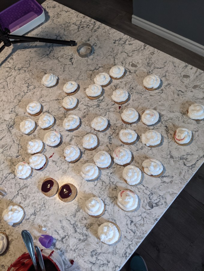 The time got away from me because the marshmallow started setting up way faster than I anticipated. I should have had the jam on the cookies before I even started making the marshmallow. Instead, I had the marshmallow all done and ready to go, then started assembling the cookies. By the time I got to piping, the marshmallow was half set and had lost enough of its liquid viscosity that I just could not pipe it into that nice dome shape. And thus were born my ugly ducklings. Again.