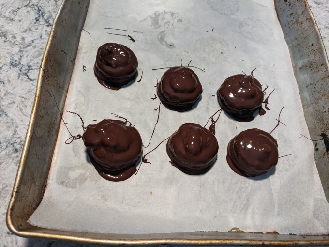 Once again, I find myself presenting “ugly ducklings” here because the inside of these were nearly perfect, but I am not happy with the outward appearance. Mine are lumpy and irregular when they should be nice, clean dome shapes. Also the chocolate on mine is way too thick. I will come back to the the why and how of these shortcomings, but the short version is I need to calm my tits lessons were learned this fine day.