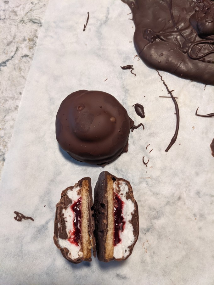 The jam gets spooned or piped onto the cookies leaving a half inch border around the edges. Marshmallow is piped on top to cover. It should be in a dome shape, but due to the solidification of gelatin, I wasn’t able to get that nice soft serve look. Accepting this, I just had to refocus on making sure the jam was covered completely so the cookies would have enough structural integrity to survive being dipped in the chocolate without falling apart.