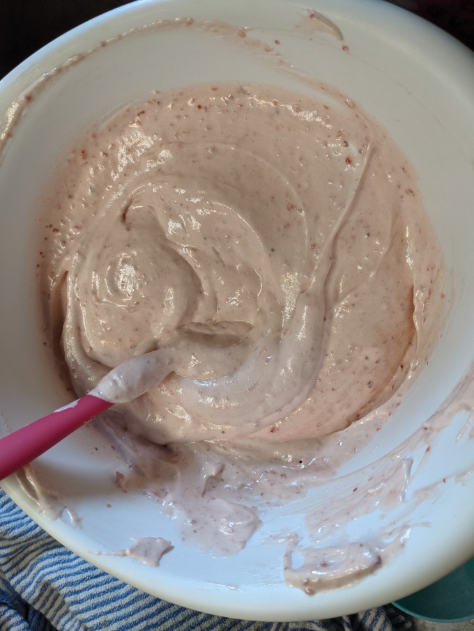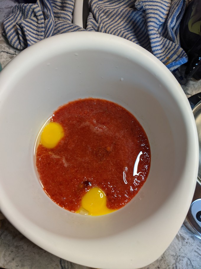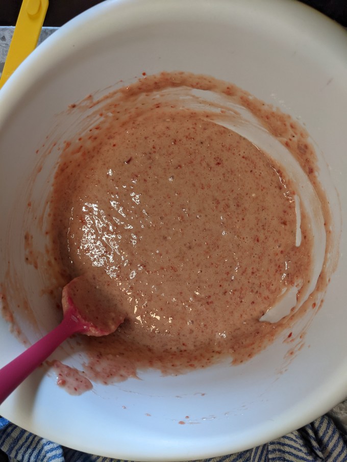 Strawberries are pureed with sugar. Dry ingredients are blended. Batter base of egg yolk, fat, and the strawberry is mixed and then combined with the dry ingredients. This is the first of many technical traps in this bake. The flour needs to be sufficiently sifted/whisked with a fork before adding to the batter base. If it isn’t, there are two possible negative outcomes. If the baker notices chunks of unsifted flour in the batter, they may be tempted to overmix to try and break them up. This will cause the final cake crumb to be chewy instead of spongy. If the baker doesn’t notice the unsifted chunks of flour, there will be unmixed flour visible (and undelicious) in the crumb. This happened to me the first time I ever made sponge cake back in high school. Disappointing lesson learned!
