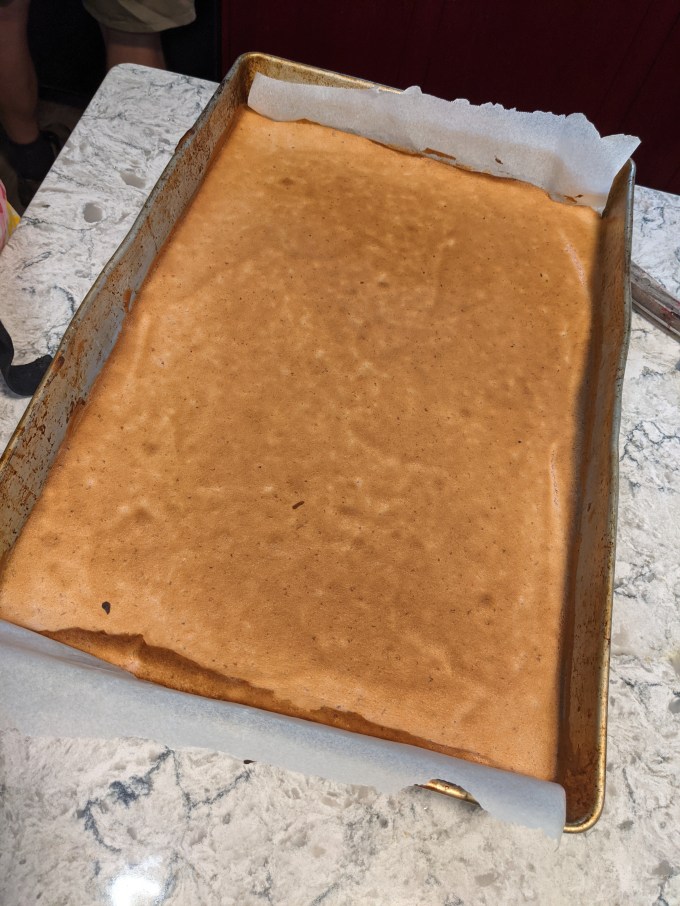 Egg whites and sugar are whipped to stiff peaks. The meringue is folded into the batter and then the batter is spread into a full size baking sheet. This is another pitfall: if the batter isn’t evenly spread, it won’t cook evenly and the spiral will be lopsided. Also it is possible to over mix the batter if you spend too much time fussing over it in the pan which can completely collapse the sponge and it will just turn into a leathery echo of sponge cake.
