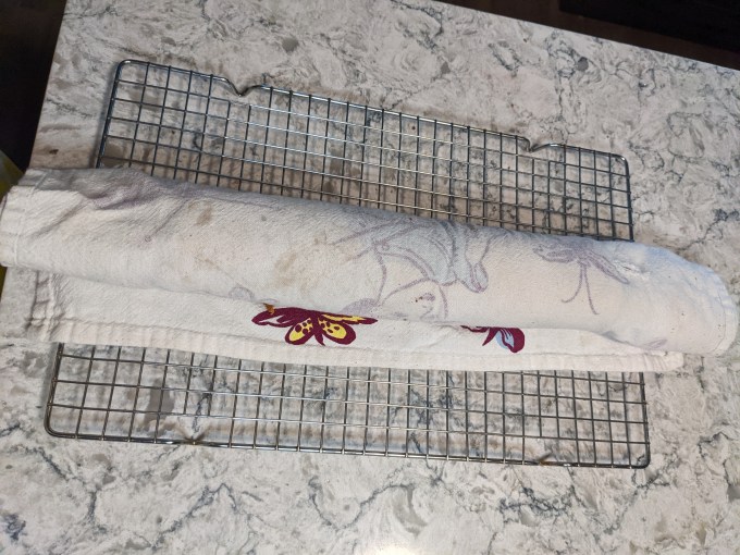 The warm cake is turned out onto a towel and the parchment is removed. As I said earlier, I think I could have left mine in the pan for a few more seconds and the parchment would have picked up more of the crust to reveal more vibrant pink in my final presentation. The cake is then rolled up, including the towel, which keeps it from sticking to itself as it cools.