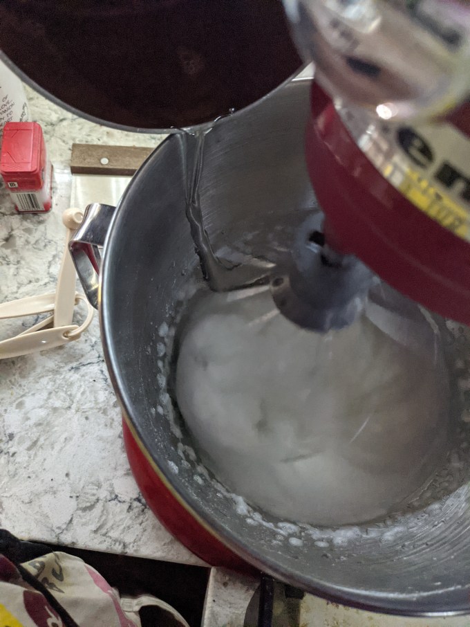 Sugar is heated to temperature. While heating, egg whites are brought to stiff peaks. This is a real feat of timing because the egg whites need to be at soft peaks when the sugar syrup is added. If they get to stiff peaks, they will overwhip before the sugar is incorporated and the meringue can’t be saved after that happens. It is necessary to manage the development of the meringue at the same time as the sugar is heating, which are both challenging skills to use on their own. Having to do both at the same time takes real confidence and knowledge, and even then I think we all go into these things quite surely ready for failure. Re-doing egg whites and sugar work are part and parcel of the baker’s life.