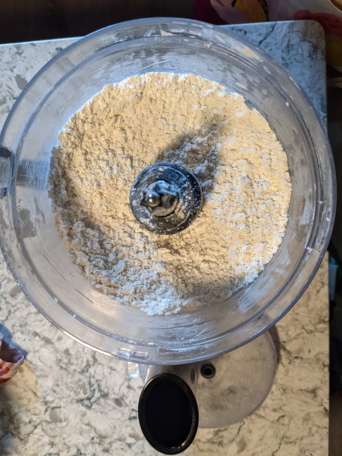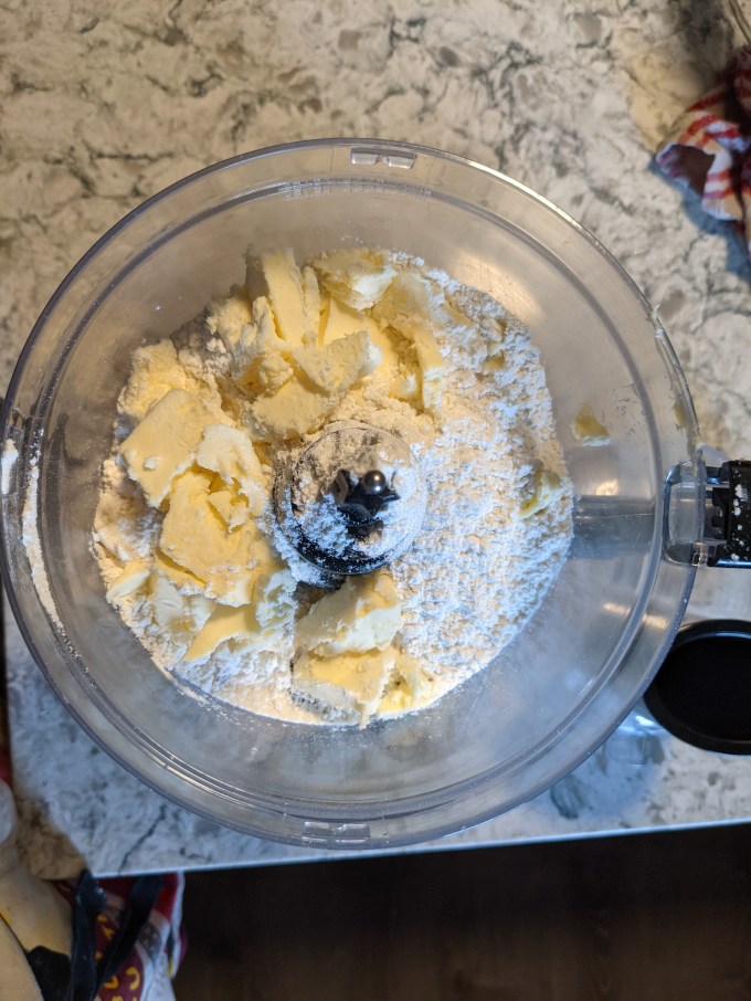 This is basic short dough method with added ground almonds (aka almond flour). Cold butter is blitzed with the dry ingredients to coarse crumbs. I prefer to do this method in the food processor, but there are lots of variations: grating the butter in, two knives, a pastry blender. Just chop that butter up and keep it cold.