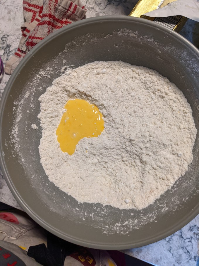 Cold liquid is added to bring together. In this recipe, the liquid is an egg, which I like. I usually add an egg to pie dough. It enriches the dough a bit and I find it a bit easier to work with than just water because the egg is sticky. As with any short dough, the key is keeping everything as cold as possible and taking care not to over mix.