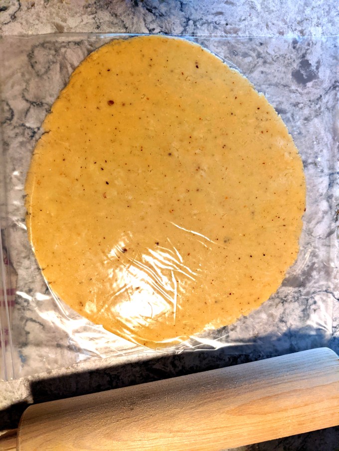 Once the dough is holdling together, it is shaped into a rough disk and put in the fridge to rest. You might notice some brown flecks in my dough and frangipane: I had a mixture of leftover ground hazelnuts and almonds from my first blog bake (!) that I wanted to use up since they have been sitting around for 6 months. The flecks are coming from the hazelnut skin.