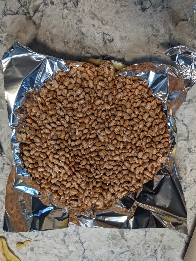 The moulded crust is then blind baked. Blind baking is the process of pre-baking a pie crust so it is cooked properly before the filling goes in. Tinfoil or parchment paper is placed on top of the prepared crust and then filled with either pie weights or dried beans. The crust is put in the oven to bake partially before adding the filling. Blind baking is also important to prevent soggy bottom and to ensure the pie crust is cooked all the way through.