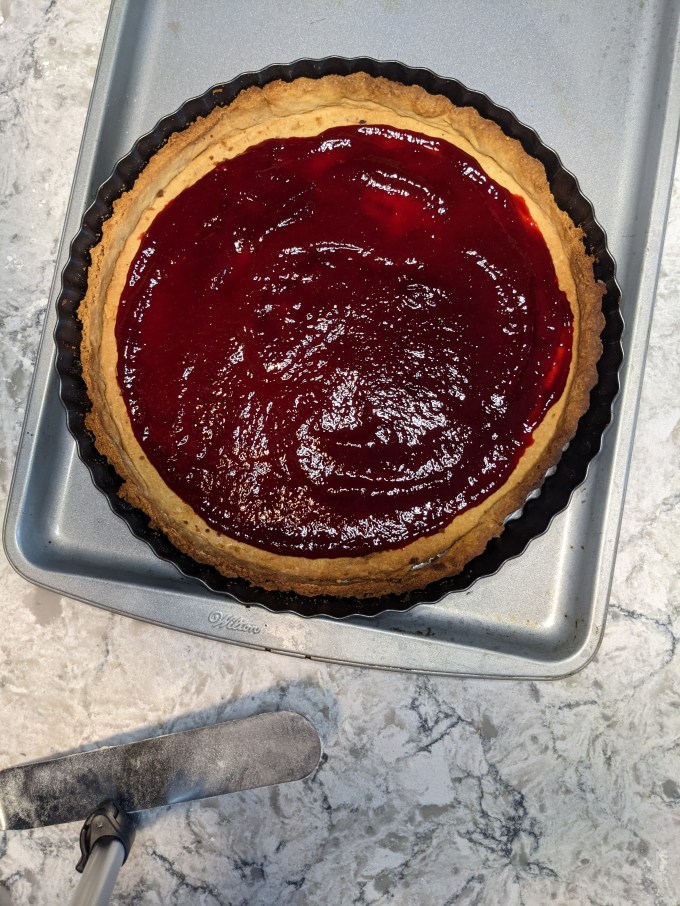 This tart was tasty, I could have done with less glaze and more frangipane, but it’s all a matter of personal preference, isn’t it? I am glad I have a proper tart pan now. I don’t make a lot of tarts or pies, but I’ve always felt I should have at least one fluted pan in the cupboard so it was worth it to make this just because it motivated me to finally buy the pan. I’m glad I took it for this test run as well because now I am armed with that critical info about tenting the edges. If I had just done this for the blind bake I think this would have been a perfect execution. See you next time!
