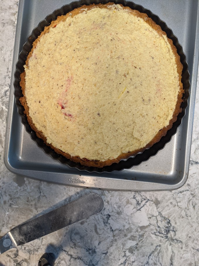 The jam is spread into the partially baked crust, then the frangipane is layered on top. This is probably the most demanding part of the bake. It is important the jam is cooked to the right consistency so it doesn’t reach the edge of the crust and boil up over the frangipane. It also takes a bit of finesse to spread the frangipane on top of the jam without mixing the two together. I used an ice cream scoop to drop large balls of the frangipane around the surface area of the jam so I didn’t have to manipulate it too much. Then it’s into the oven we go.