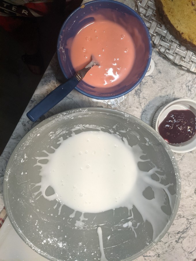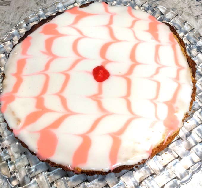 Once the baked tart is cooled, it is ready to glaze. This is a simple icing sugar glaze made of icing sugar and water and a bit of almond extract. A portion of the glaze is reserved and dyed pink with food colouring. The white glaze is spread on top of the tart. The pink glaze is piped on in parallel lines and then something pointy (I used a bamboo skewer) is dragged back and forth through the lines to create a classic feathered effect. Top with a glace cherry and the Bakewell Tart is complete.
