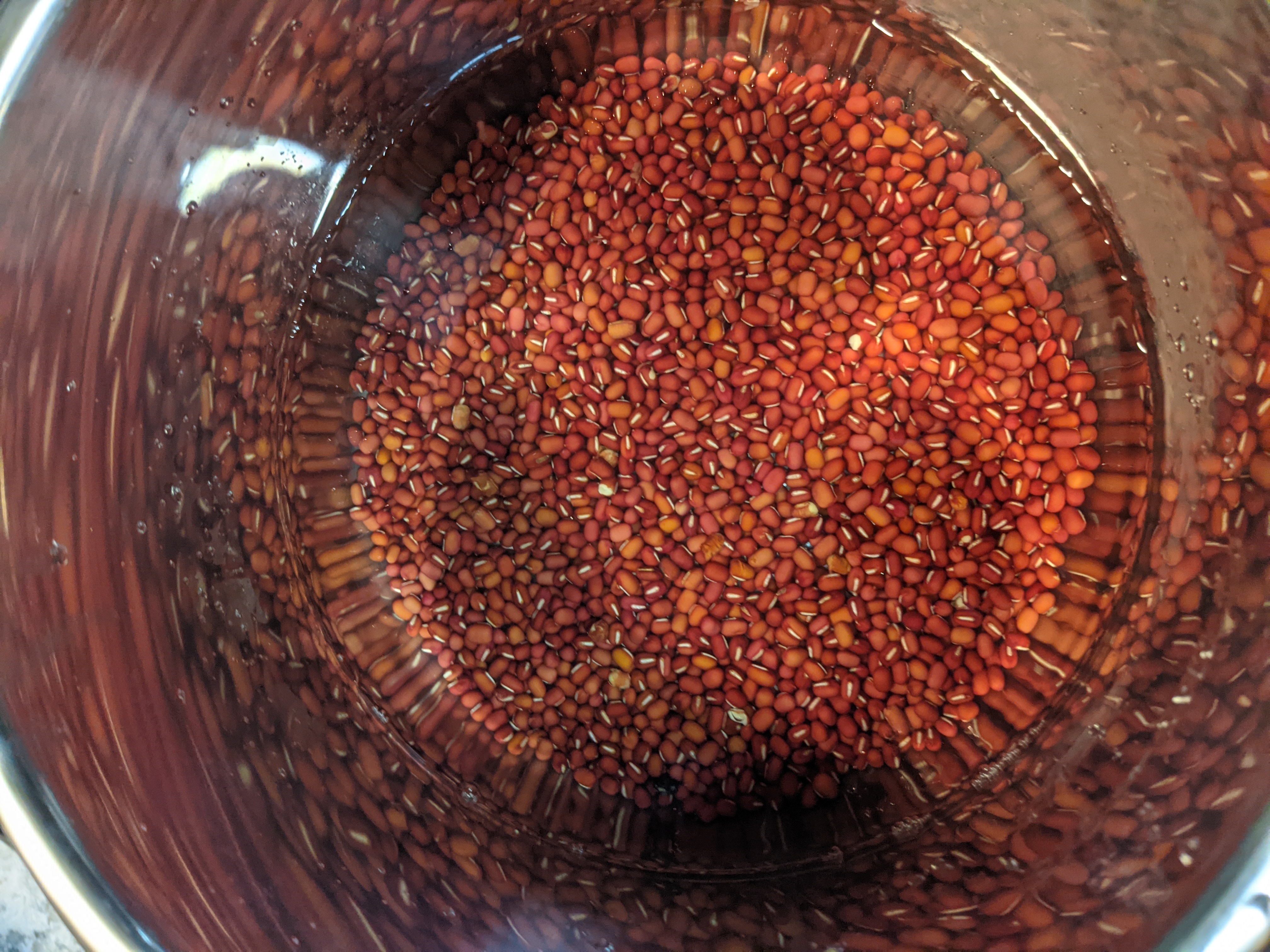 Adzuki beans are rinsed and cooked in a pressure cooker until completely softened. The beans are drained and then returned to the heat. Sugar is added and the beans continue to cook until all the liquid is absorbed.