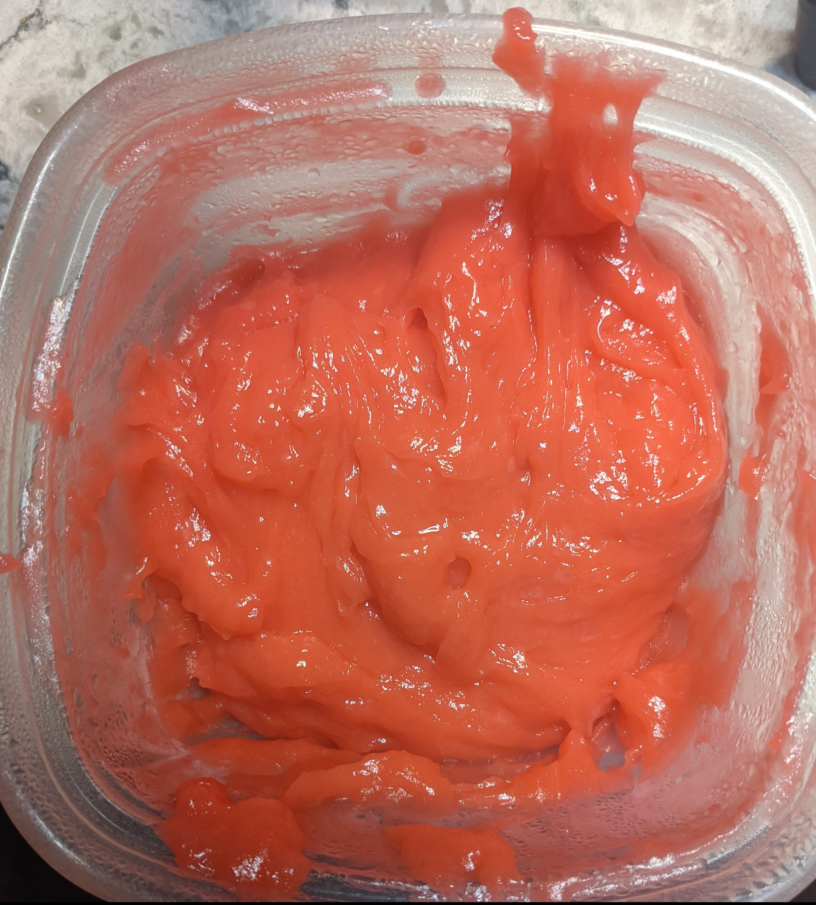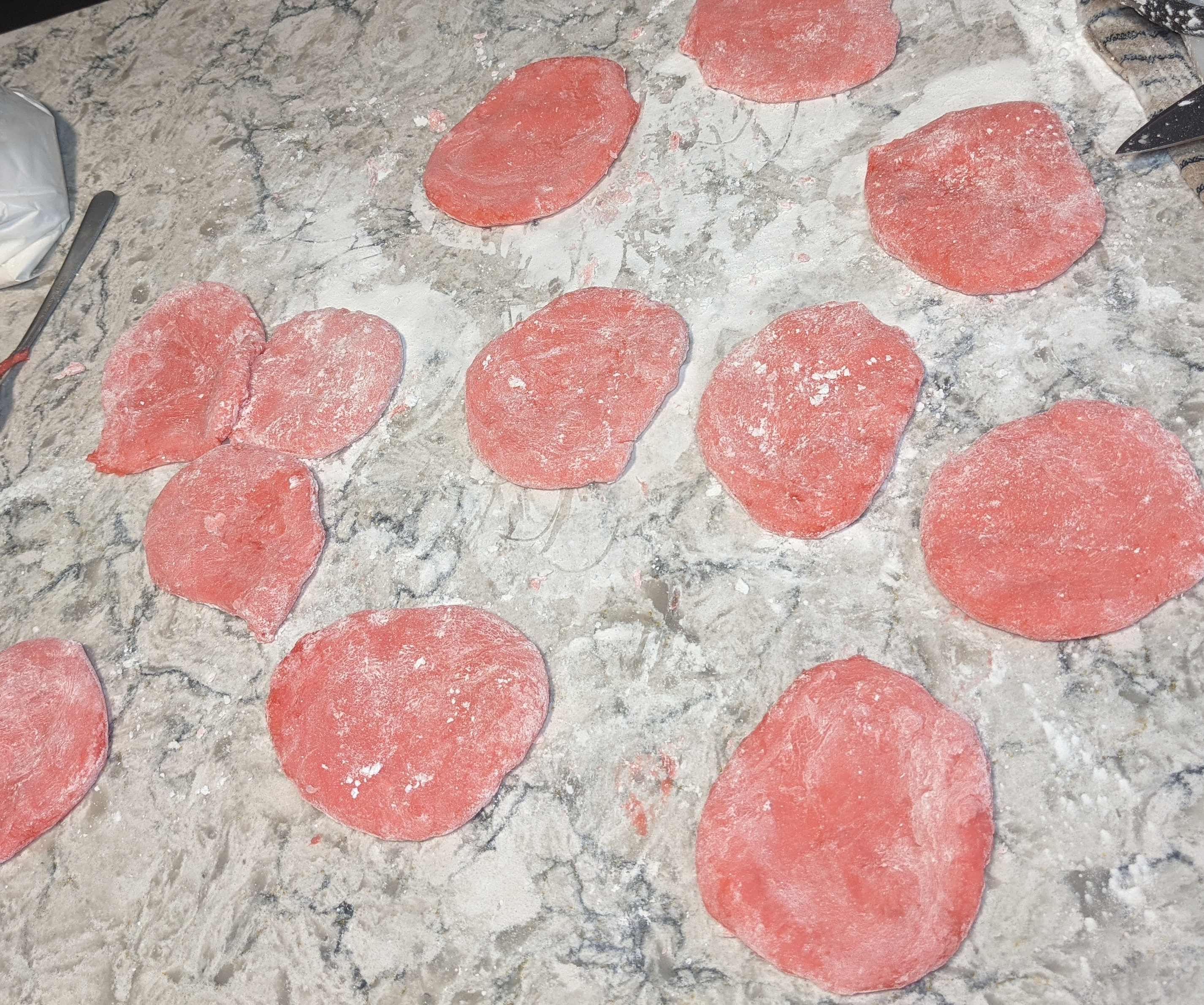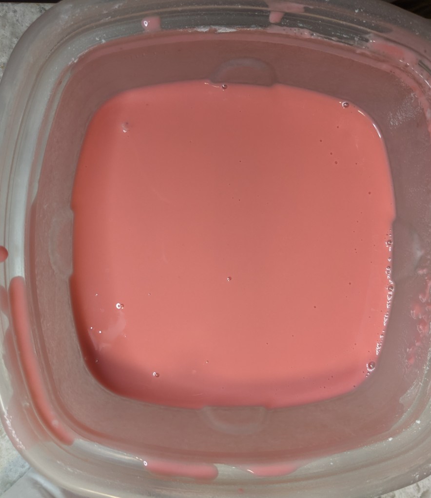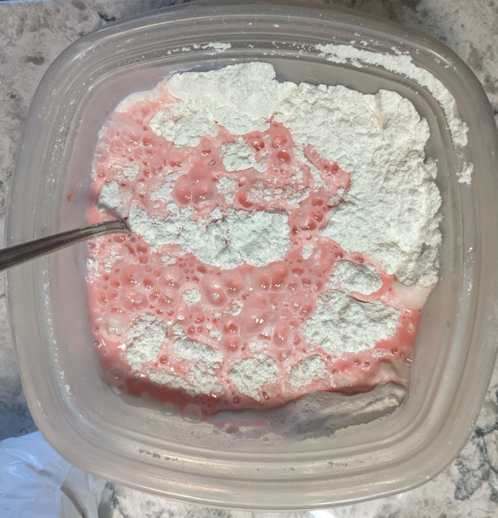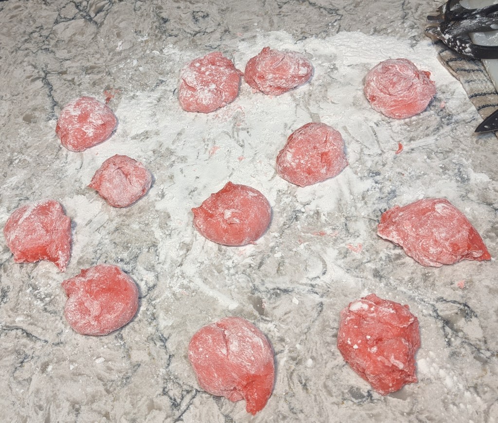 Once again I find myself at the mercy of an inadequate CBC recipe. Right off the bat I knew I had a problem when this called for red food colouring. Looking at the photos, I thought, hmmmmm maybe pink would be better, but I didn’t trust my own judgment because I was trying to follow the recipe. So I put a drop of red in and BOOM, as we can see, my mochi dough became alarmingly red instead of nice soft pink the way they are supposed to be.