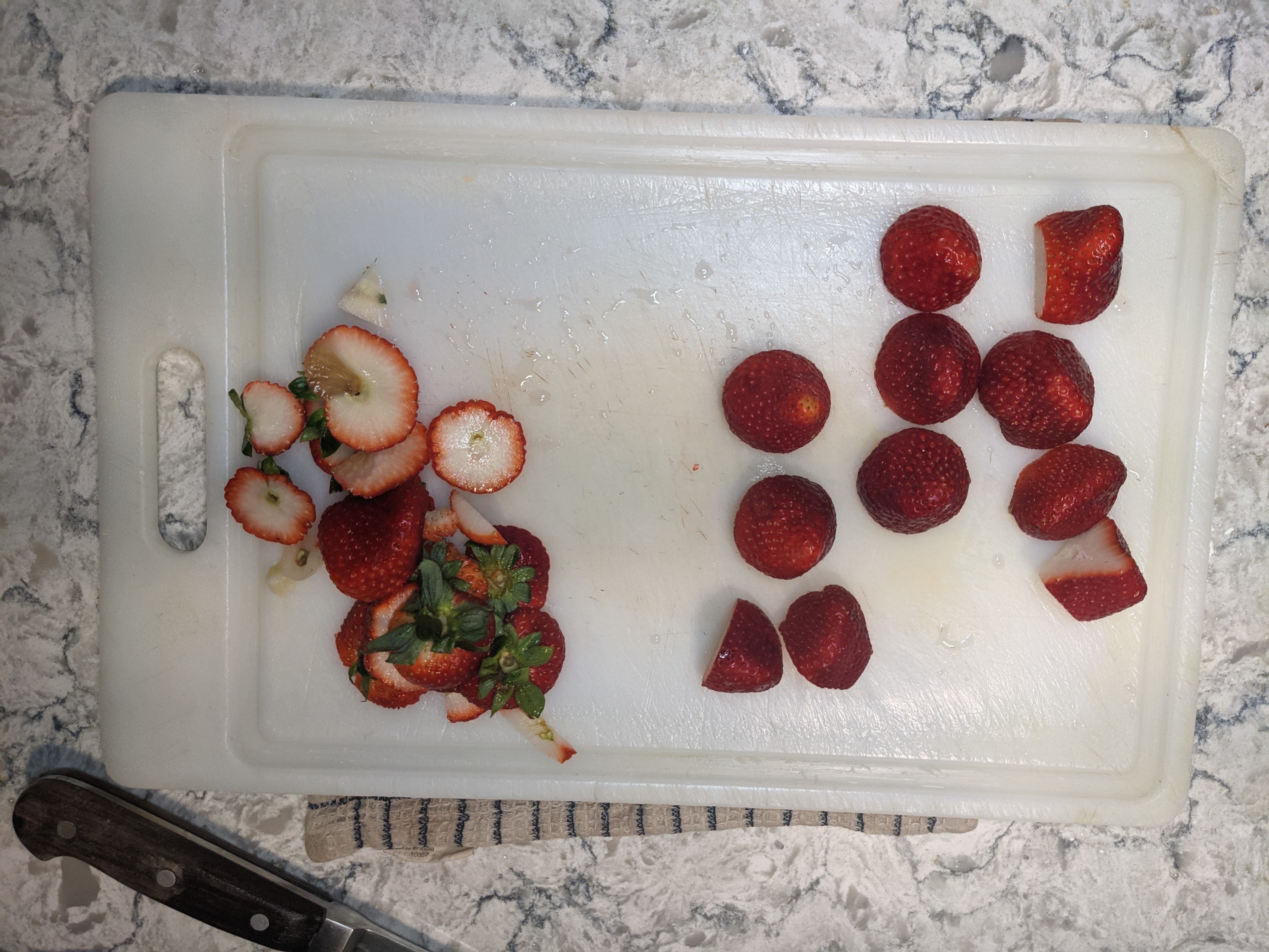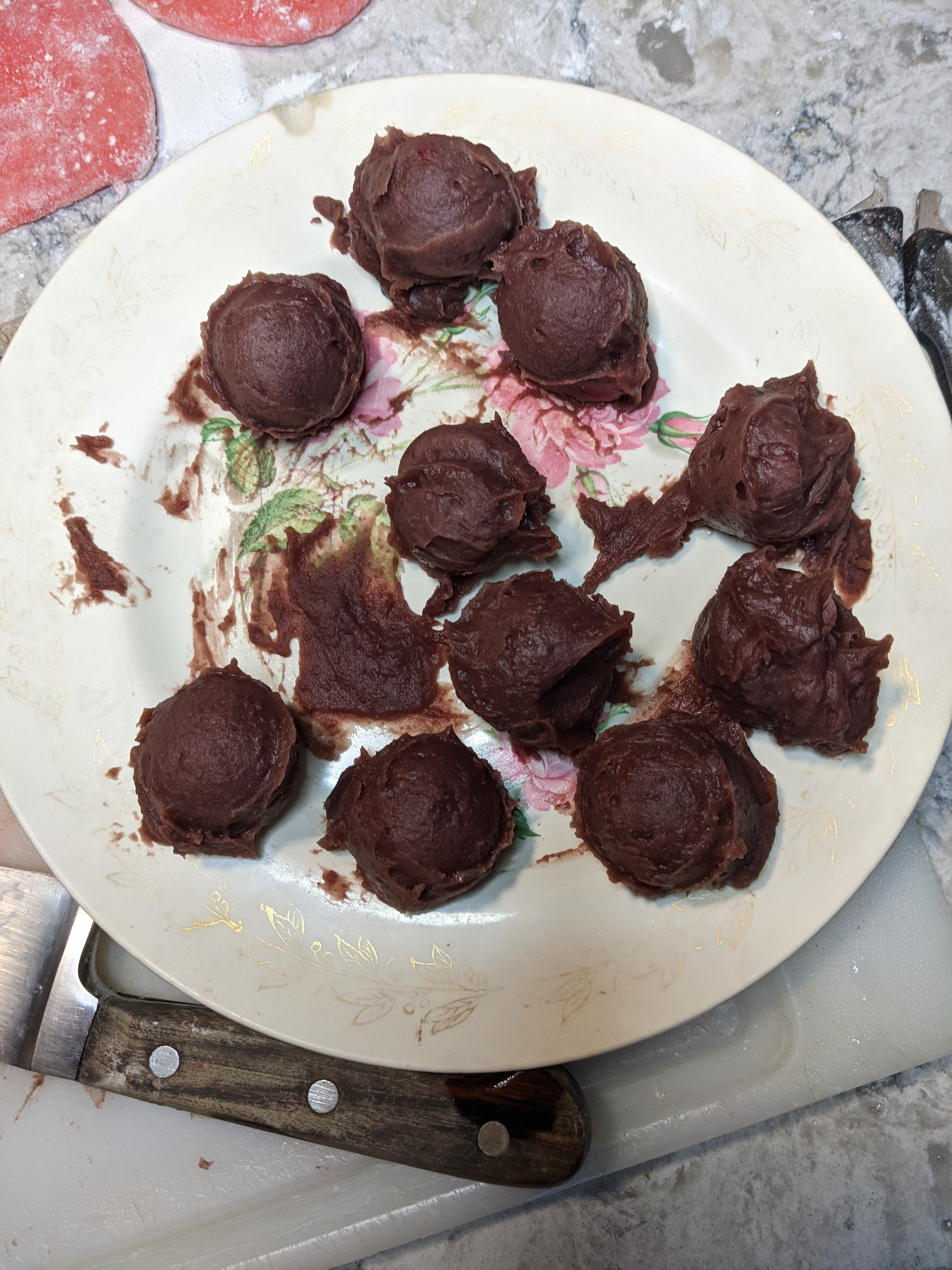 As I mentioned, I cut the strawberries into bite size pieces. I couldn’t get my bean paste as thick as it needed to be to roll it around the strawberries. What I ended up doing is I took an ice cream scoop and scooped up a ball of paste. Then I pushed the cut strawberry into the scooped paste until it was totally enveloped by the paste and then used the release on the scoop to drop the paste ball onto a plate. It worked well enough. I put the balls of scooped paste into the fridge to get them to firm up as much as possible.