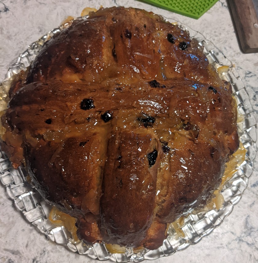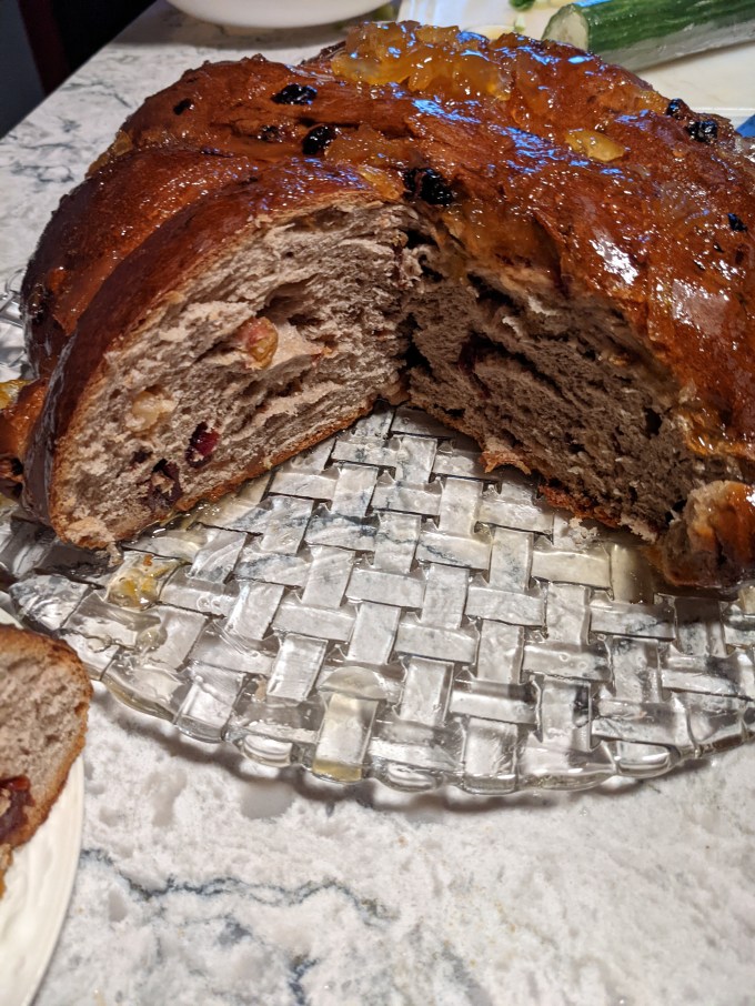 Well, we are off to the races now! Here is the Greek Christmas Bread, which is a variation of a larger category of Greek celebration breads which are collectively referred to as Artos. This bread is basically a giant hot cross bun. The dough is well spiced and flavoured with orange and almond extracts. Eggs, olive oil, milk and honey enrich the dough to add flavour and increase shelf life. The Christopsomos version also has dried cranberry, cherry, raisins, and toasted walnuts. The decorative cross on top is the traditional presentation. Mine is also covered with a candied citrus glaze, making for a hearty breakfast or afternoon snack.