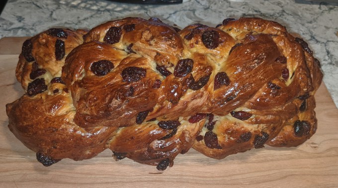 Hello there Friends and Fellow Bakers! Here we are with the third holiday bread I have chosen: Cranberry Walnut Celebration loaf. This is actually an original recipe from the Bread Baker’s Apprentice and as far as I am aware, is not a traditional bread at the moment. Let’s make this its grand debut, because it is right at home with the big guys. This is a simple egg bread flavoured with orange extract and loaded to the brim with cranberry and walnuts. I will definitely use this basic dough to make other types of loaves since it made an excellent base for add ins. I also went with the suggested presentation of a double decker braid which is both elegant and functional since the loaf slices up nicely.