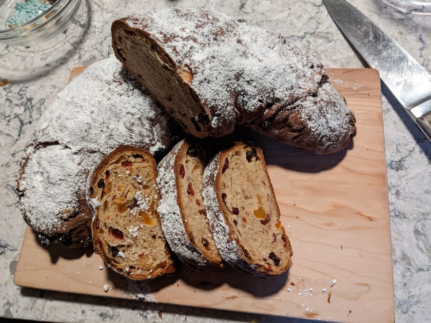 The shape of the stollen is meant to evoke the swaddling blanket of the baby Jesus. I’m not sure I got it quite how I wanted. There should be a line of fruit running through the middle (ish) but mine all seems to look fully incorporated. Win some, lose some.