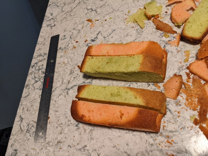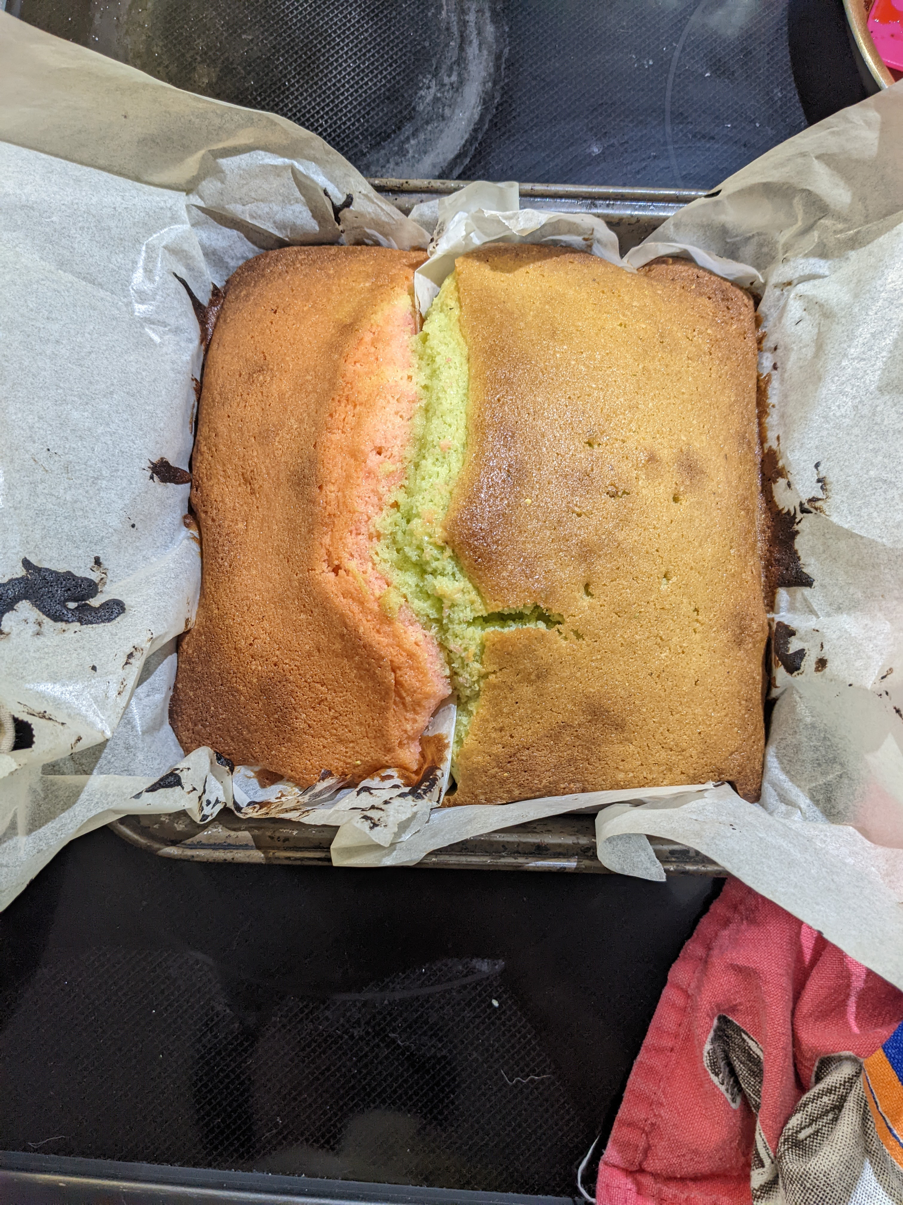 In this version with the added challenge of baking two cakes in one pan, the first step is to prepare the pan so it is divided in half by a folded sheet of parchment. I now realise I would have been more successful at this step if I had made the folded part much taller. The way I did it, the paper did not have enough structural integrity to hold the batter in place before it was cooked. I would say lesson learned, but there isn’t really a good reason to bake this way, in my opinion. Just use two pans or one pan twice like a normal person CBC. I think this was more of a reality-tv production choice than anything else to make the challenge harder for the contestants. There isn’t anything to learn here, so just move along. Work smarter, not harder as they say.