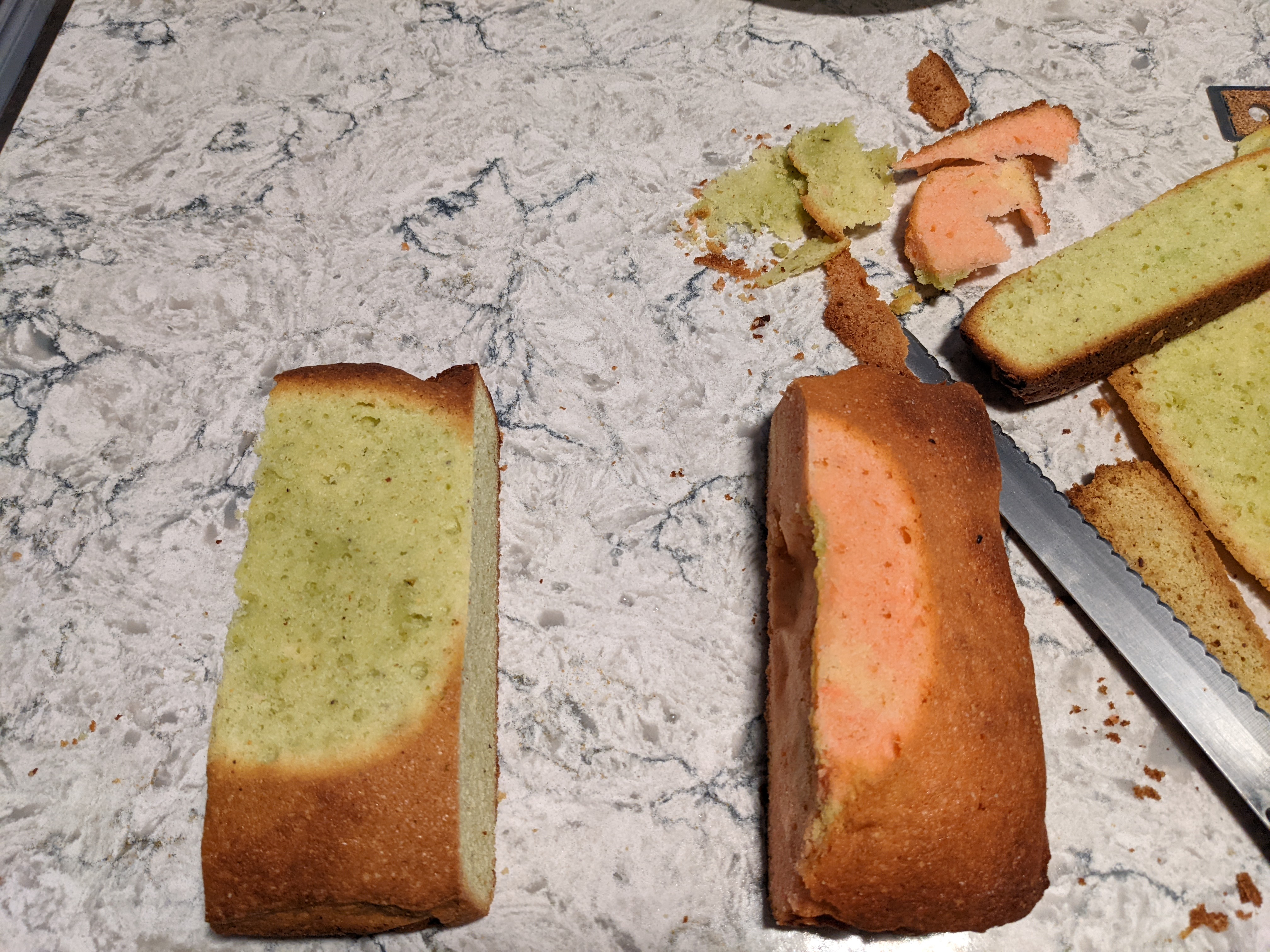 The battenberg cake is a British cake that is made to have a distinct checkerboard pattern of two different sponges inside. The layers are held together with jam and the entire cake is wrapped in marzipan. This version from Season 1, Cake week of GCBS (recipe here) also has an additional layer of fondant on the outside to make a nice, clean presentation. The sponge for this cake is quite simple. A cursory search suggests that the colours are usually pink and yellow. This GCBS version was pink and green, using pistachio for the green and cherry for the pink. I couldn’t find the cherry extract called for, so I just used almond. The recipe for the sponge itself was a basic butter cake; this is exactly how I make cake when I am winging it and not actually using a formula.