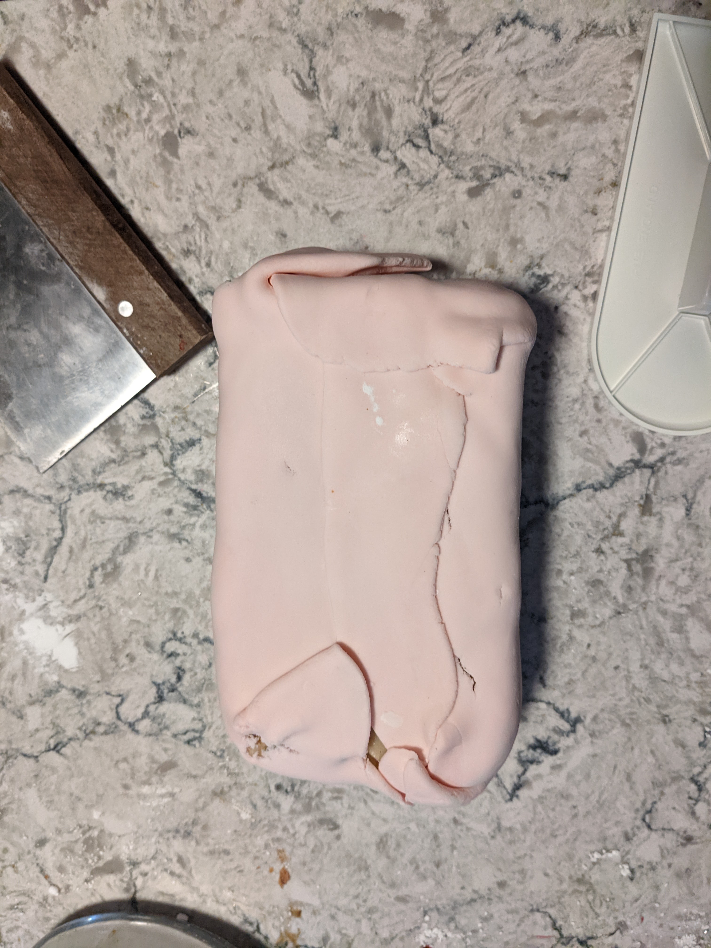 Once the cake is built, marzipan is rolled out and wrapped around the outside. In this version, prepared fondant is lightly coloured with a touch of pink and also rolled up and wrapped around the outside. The ends of the cake are trimmed off for final presentation so the checkerboard is visible and all that excess marzipan and fondant is removed. And that is all there is to it! Short and (incredibly, grossly) sweet.