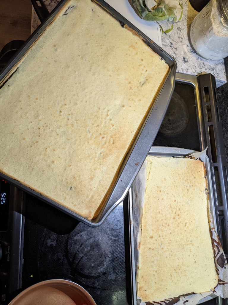 Anyway, the batter is spread over the chilled decor paste and the pans are baked until the cakes spring back when pressed. The pans are cooled for a few minutes and then the warm cakes are turned out to cool completely.