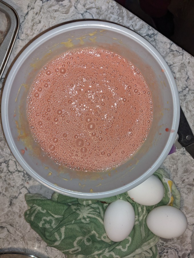 Egg yolks and sugar are beaten until pale and thick. The raspberry mixture is added and combined. Heavy cream is beaten to stiff peaks and the raspberry mixture is folded in. This is where I started sweating a bit. I know how the final mousse is supposed to be when it’s set, but the mix at this point feels very loose and I am worried about deflating the cream too much. I just tried to take it very slowly and get everything combined. By the time I was done, I was feeling cautiously optimisitic.