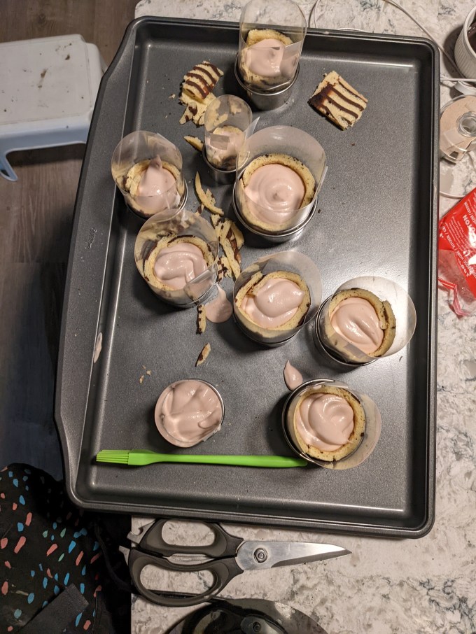 I took some liberty with the portions on mine. The CBC recipe was to make 12 uniform 2.75 inch single servings. I shopped a little bit for 2.75 inch cake rings and the only thing I was able to find would have cost me like $36 for 12. I don’t think so, not for cake rings I will definitely not use unless I decide to make these stupid things again. Instead, I bought a 12 piece set that had 12 DIFFERENT cake rings. Between this set and my circular cookie cutters, I was able to make 4 pairs of different sized rings and one large 6-inch cake. It all worked out just fine and I didn’t need to scale any of the recipe components to make it work (and I didn’t have a terrible amount of waste, either).