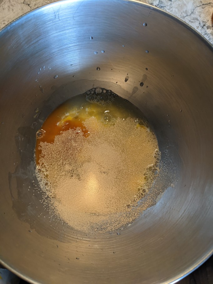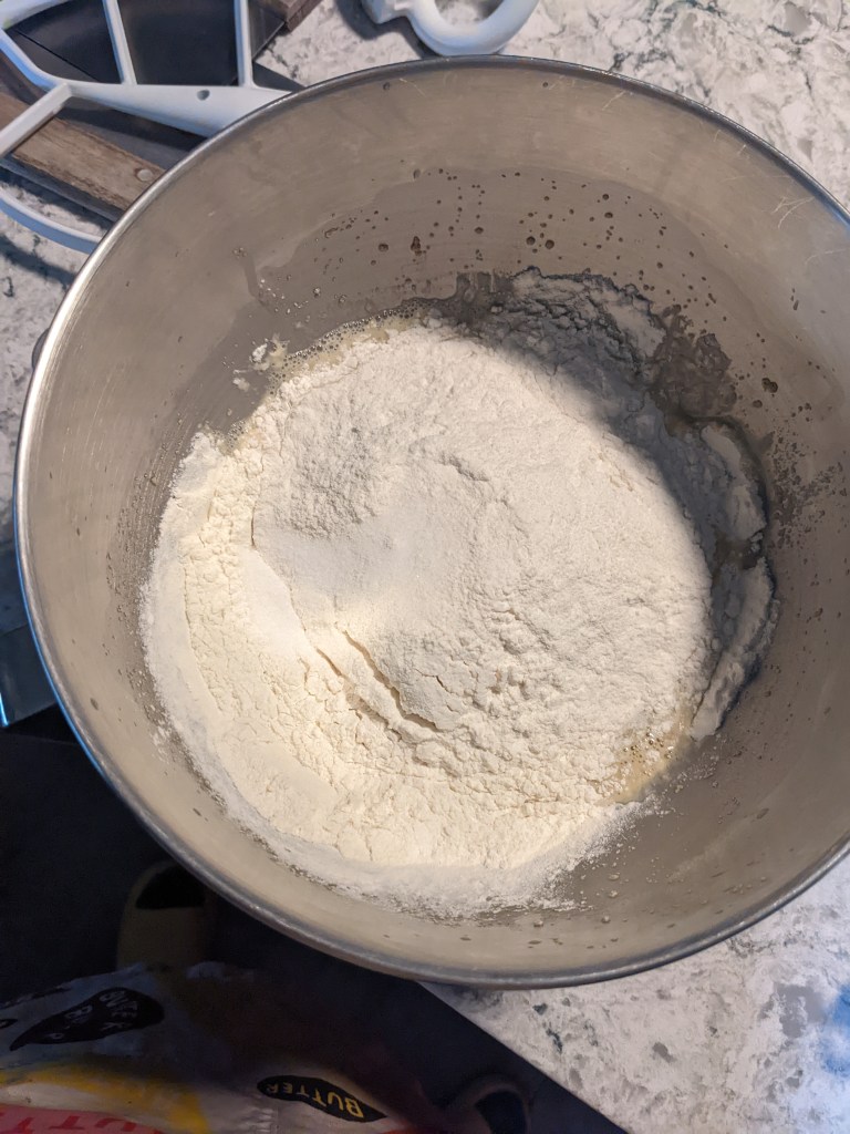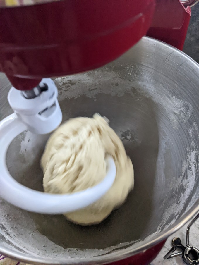 This is a simple direct dough enriched with eggs and butter to make it a bit more soft and fluffy. The eggs and water are busted up a bit together, then the sugar, yeast and vanilla are beaten in to create a base. The flour and salt are added and then the dough is worked until it comes away from the sides of the bowl. The butter is added gradually, and then the final dough is worked a bit longer so the butter is fully incorporated and the gluten is well developed. The final dough is soft and elastic; tacky but not sticky.