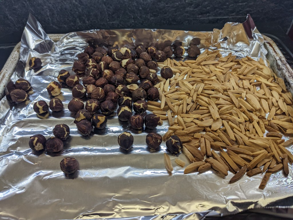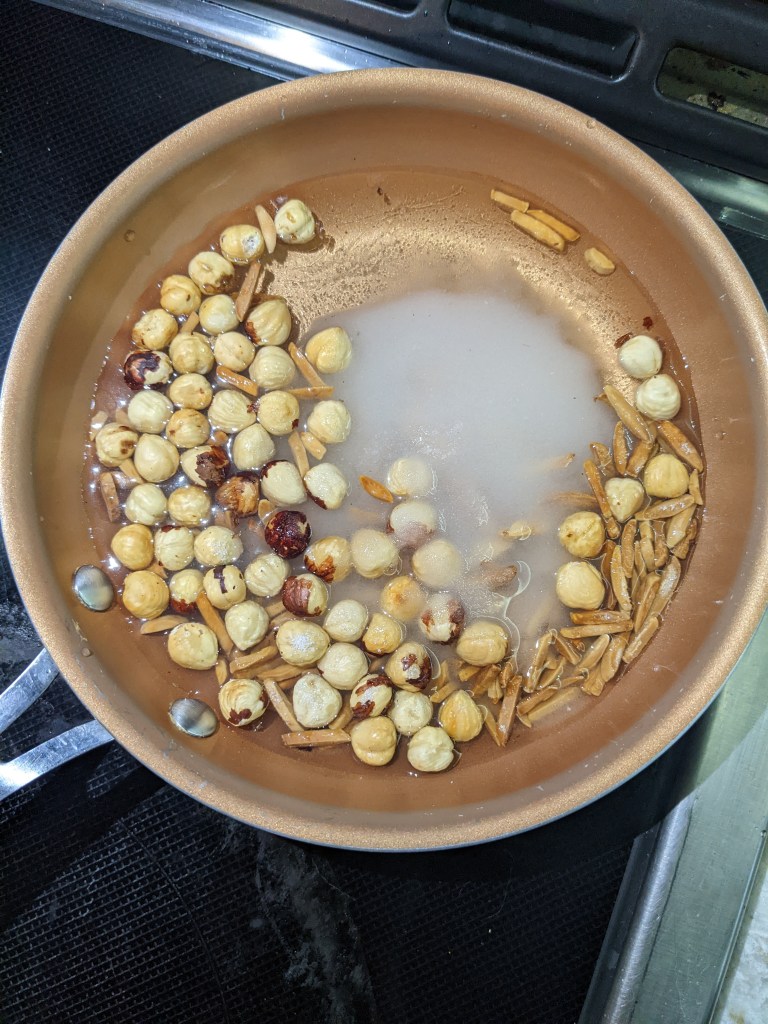 While the dough is proofing, pralines are made from scratch. The recipe called to toast the hazelnuts but not the almonds for some reason. I decided to go a little rogue and toast both. The almonds are maybe a smidgen too dark, but praline is supposed to have a slight burnt sugar taste anyway. A marginally over-toasted nut is easily forgiven in this instance. Once the nuts are toasted, the hazelnut skins are removed by rubbing the nuts together in your hands, causing the skins to come free and peel away from the nuts. It’s serving very “warming your hands over an open fire” kind of vibes to get the skins off.