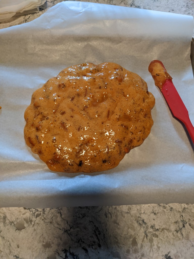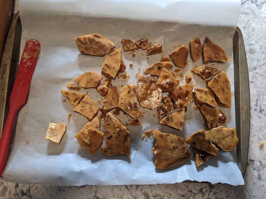 Once the praline mixture is at the correct temperature (between 300 and 310F), a small amount of baking soda is rapidly stirred in, then the mixture is turned out onto a lined pan. Baking soda reacts with liquid sugar to release carbon dioxide gas. More soda = more bubbles. This is the same process as making honeycomb toffee or Korean dalgona candies (which had a moment after their appearance on Squid Game); the only difference between the three is the ratio of soda to sugar which impacts how much the candy puffs up as it hardens.