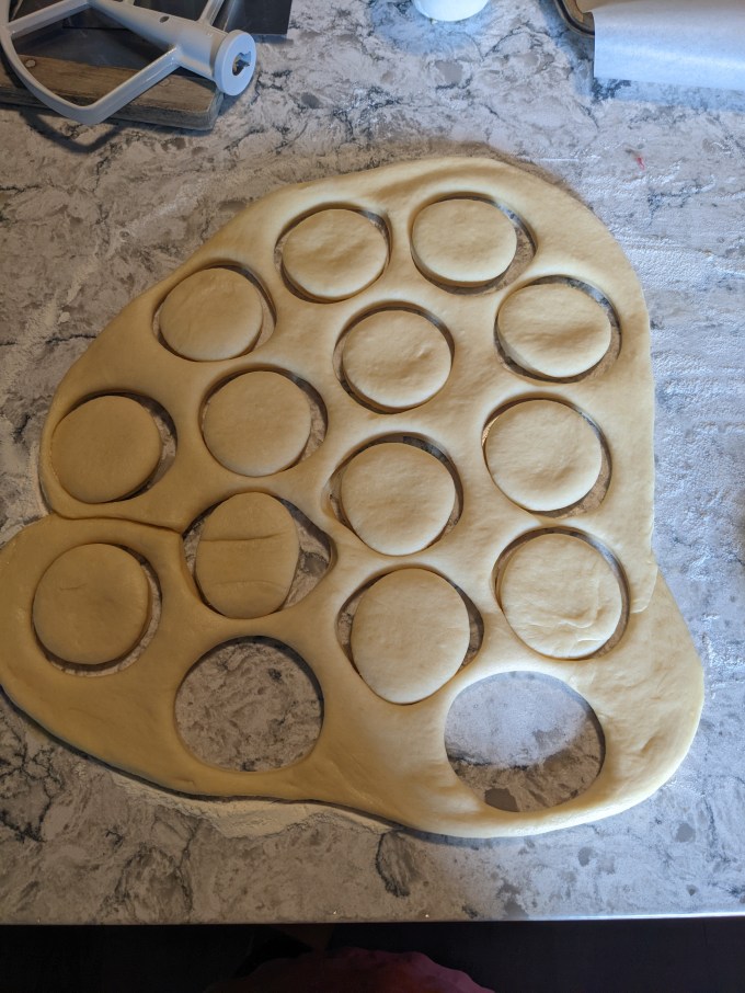The dough is left to proof until doubled in size. Once proofed, the dough is punched down and worked slightly until it is a rough disk shape. The disk is rolled out to ¾ inch thickness and then the doughnuts are cut using a 2 ⅝ inch round cutter. The cut doughnuts are put on a sheet for second proof.