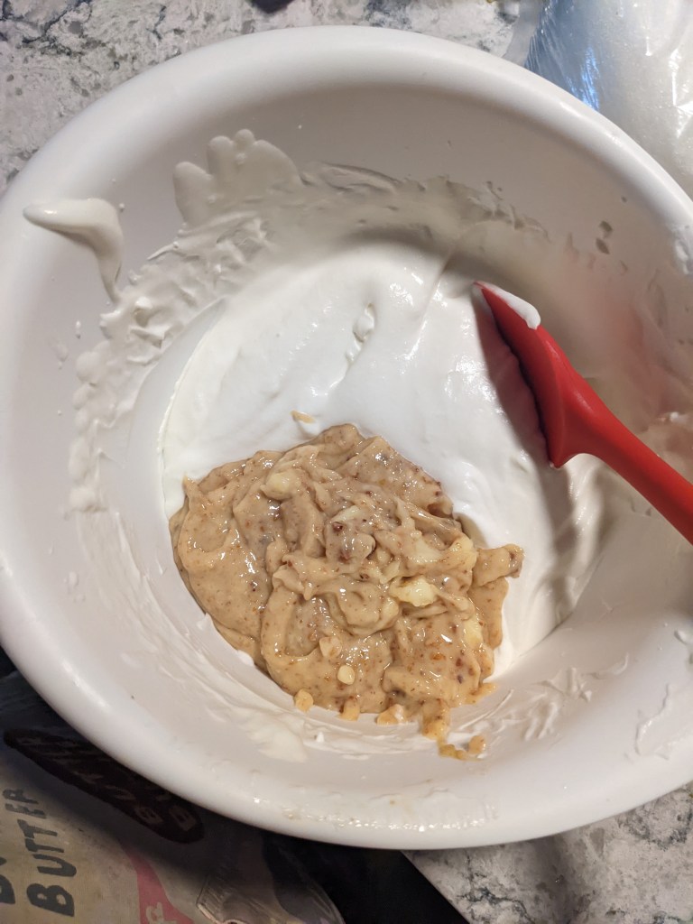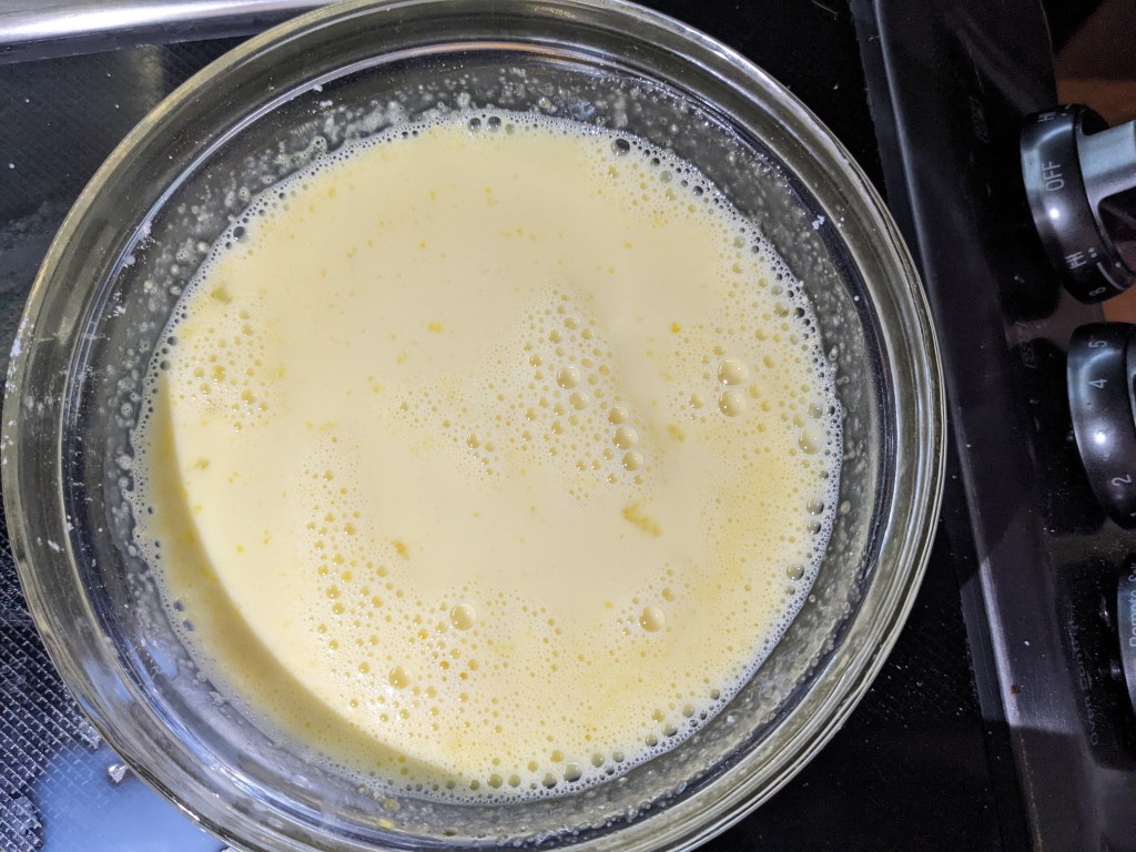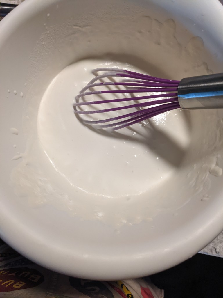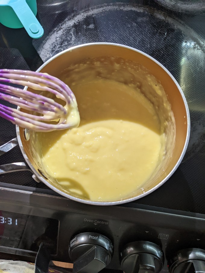 This version starts with basic gelatinized pastry cream. Gelatin is bloomed in water while milk is warmed on the stove. Eggs, sugar, cornstarch, vanilla, and a bit more milk are whisked together. Once the milk is scalded, a small amount is whisked into the eggs to temper them. The warm mixture is combined with the rest of the milk and everything gets put back on the heat. Whisking constantly, the cornstarch thickens the mixture, and that is the story of pastry cream. The bloomed gelatin is whisked in and the pastry cream is put in the fridge to set.