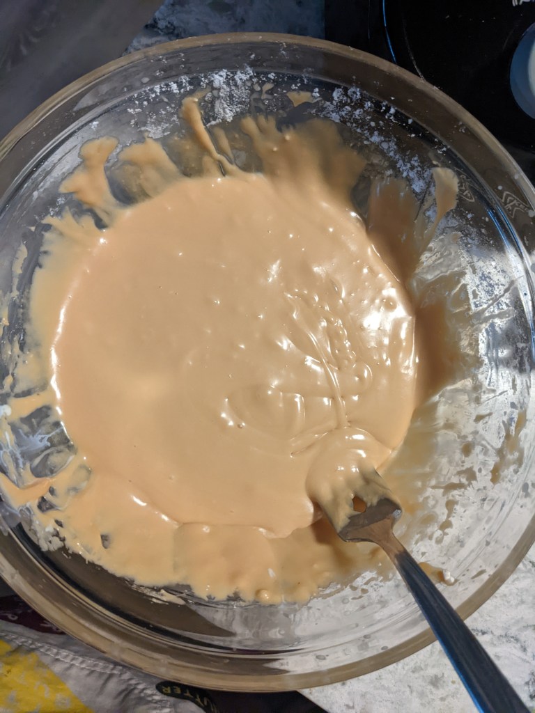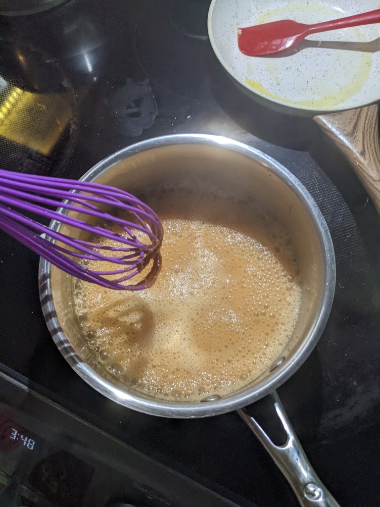 Once the caramel is ready, a little bit of heavy cream is added and then the mix is heated again until everything is smooth and incorporated. Once the glaze is cooked, a little bit of butter is stirred in and then icing sugar is added until the glaze has the right consistency for dipping.