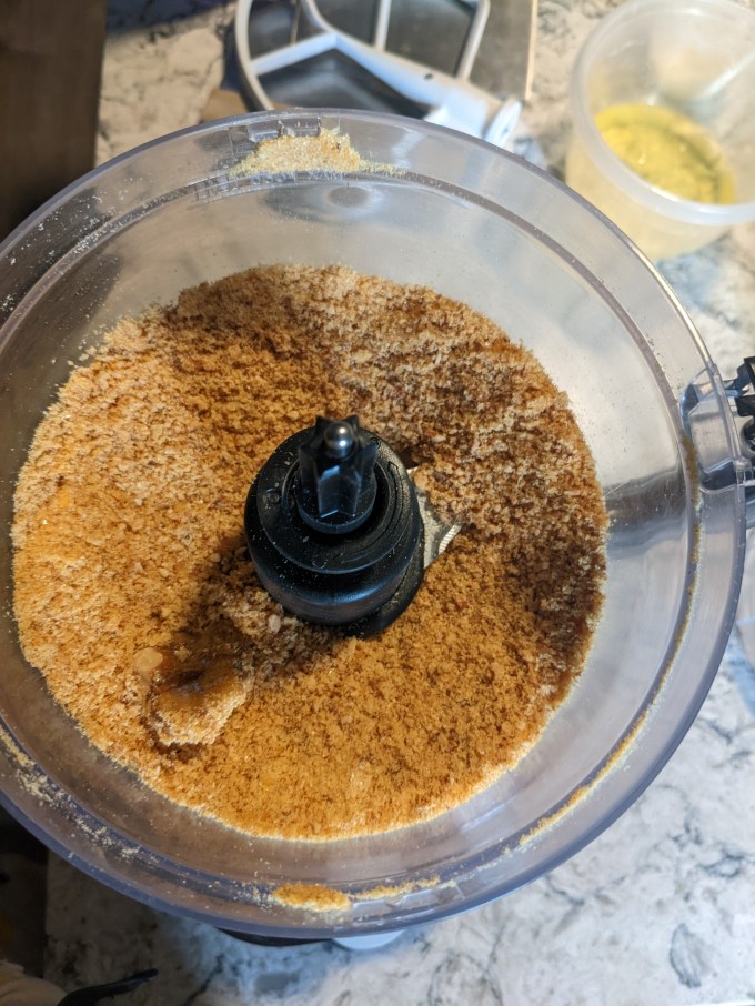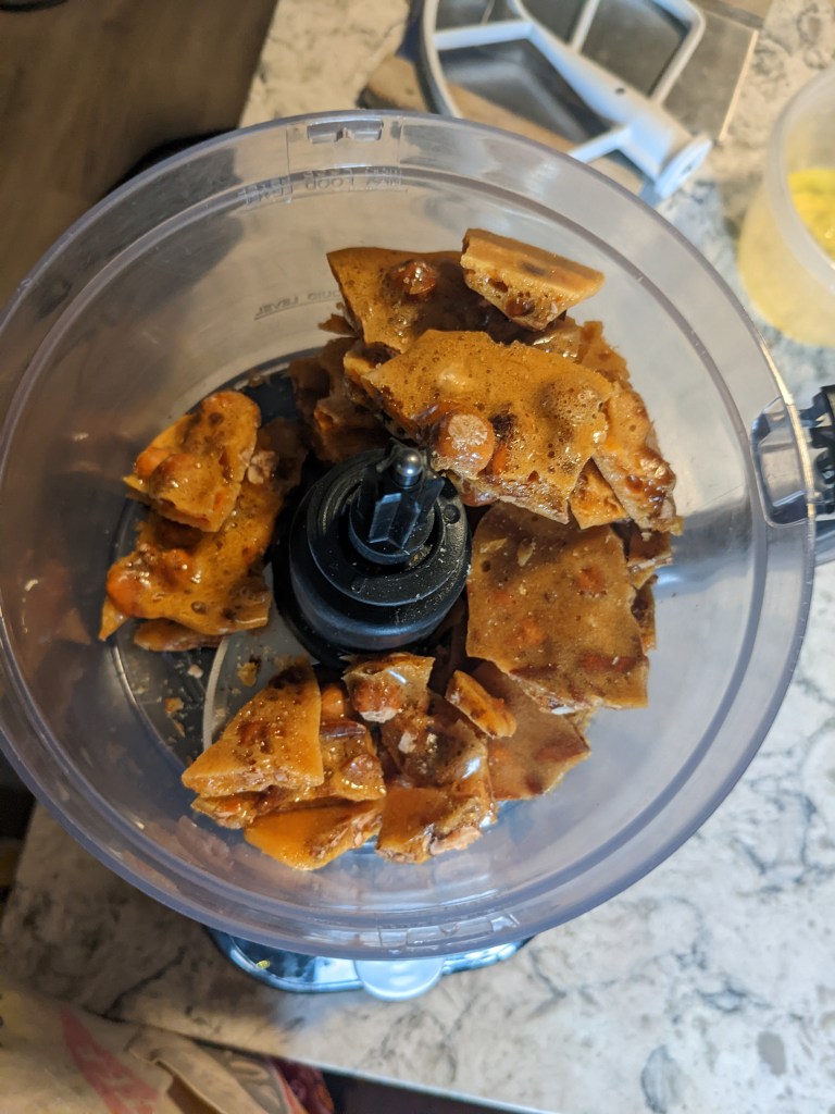 Once the praline is fully hardened, it gets blitzed in the food processor to fine crumbs. Some larger pieces are reserved for decoration.