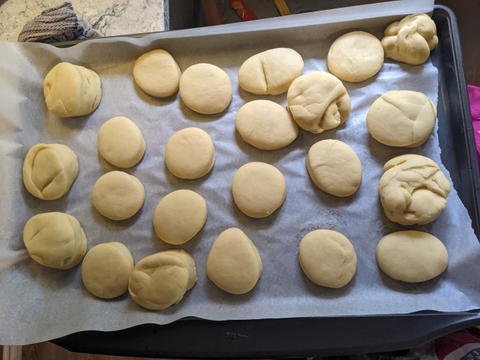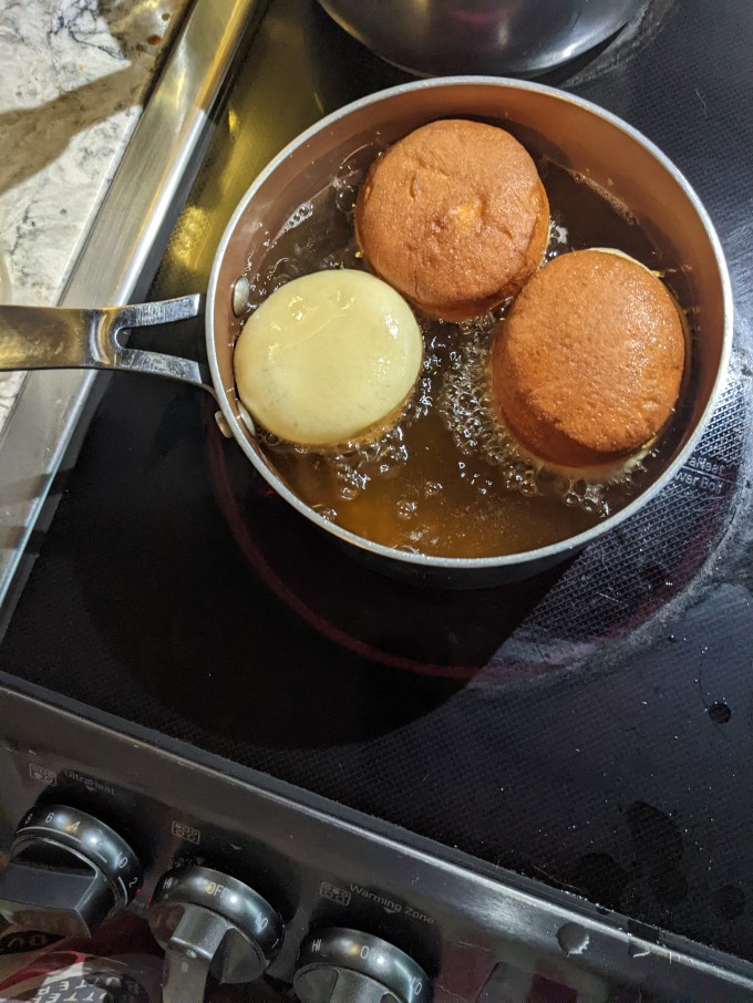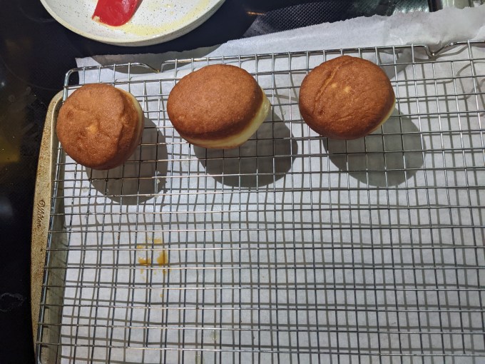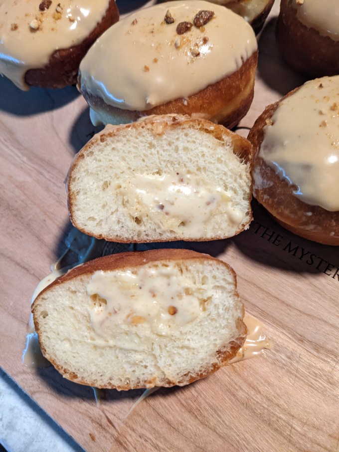 My notes on this bake are the usual mix of finicky nonsense. I rolled the dough too thin which means I made too many units. They turned out fine but they were too small. The element I had the most difficulty with was filling the doughnuts, which kind of surprised me. I think I let them cool for too long. It would have been easier to fill them as I was waiting for them to fry. Instead, I fried all of them and then started filling once the first few were cool. I also might have tried poking around inside with a skewer just to see how the fill worked out that way. I am used to filling choux pastry, which basically hollows itself out for you. Doughnuts are more like a dinner roll so the crumb is much sturdier when set (thanks, gluten xo). I also followed the recipe instruction to use the star tip for filling these, which is a strange choice since the pastry cream has ground up pralines in it. I had set up my piping bag to use a coupler with the star tip. My long filling tip doesn’t fit on a coupler, so I wasn’t able to just swap the tips out without setting up and filling a second bag, which would have deflated the cream, so I just toughed it out and basically failed. This also had the unfortunate result of wasting at least half the batch of pastry cream because I didn’t use enough of it to fill the doughnuts, despite making too many. Win some, lose some.