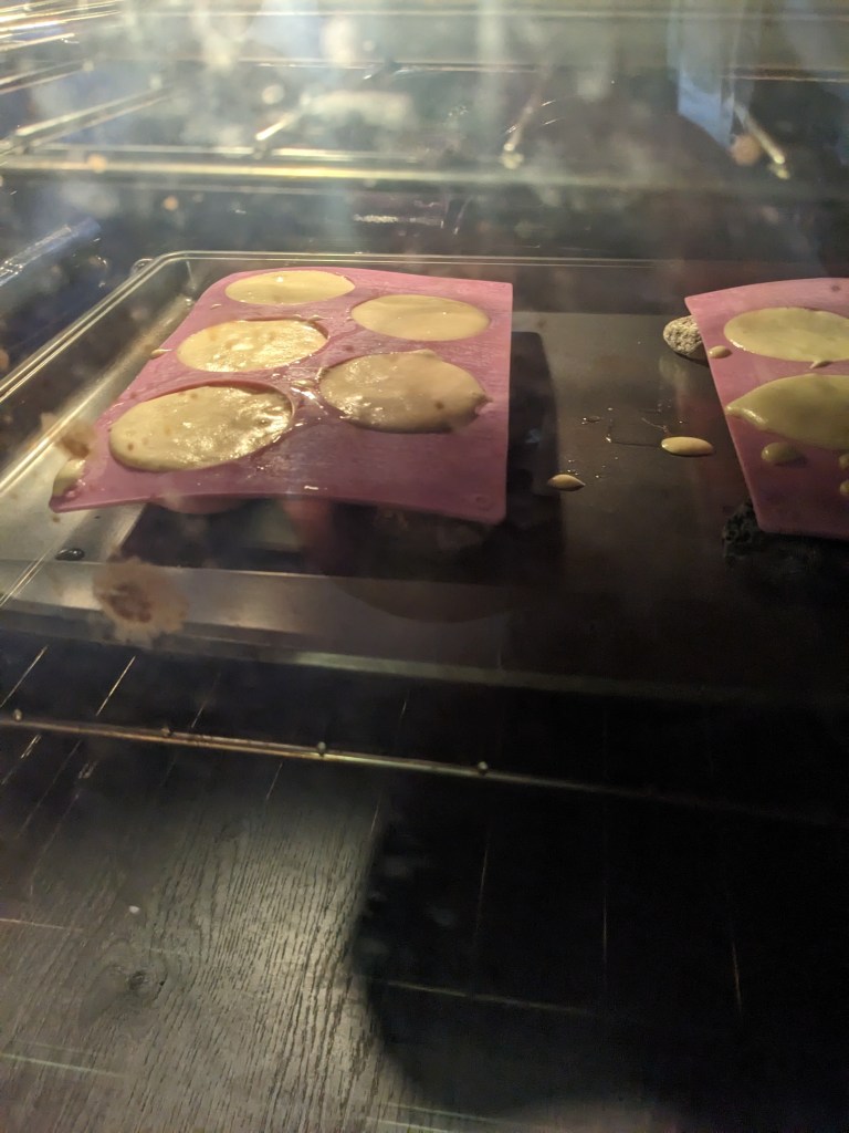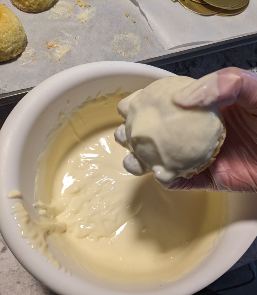 The batter gets turned into greased 3-inch hemisphere moulds. The moulds need to be propped up with something oven safe so they stay level. Otherwise, the corners of the moulds sag and the batter will be lopsided in the oven. Shout out to my buddy Jim, the rock collector and amateur geologist. I have many dozens of cool rocks he has given me over the years and I found a couple that were the right height to prop up my moulds. If there is any PSA I can offer for this bake, it is to befriend a rock guy. The cakes go into the oven and bake until a tester comes out clean, then left to cool completely.